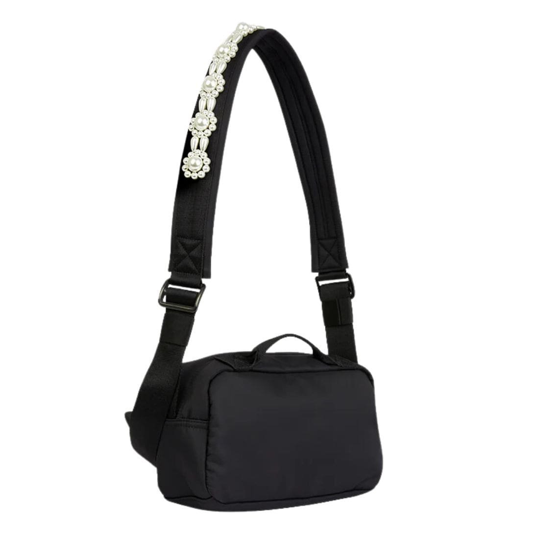 Introducing the black La Garconne Simone Rocha Bow Crossbody Bum Bag adorned with floral beaded embellishment crafted from nylon.