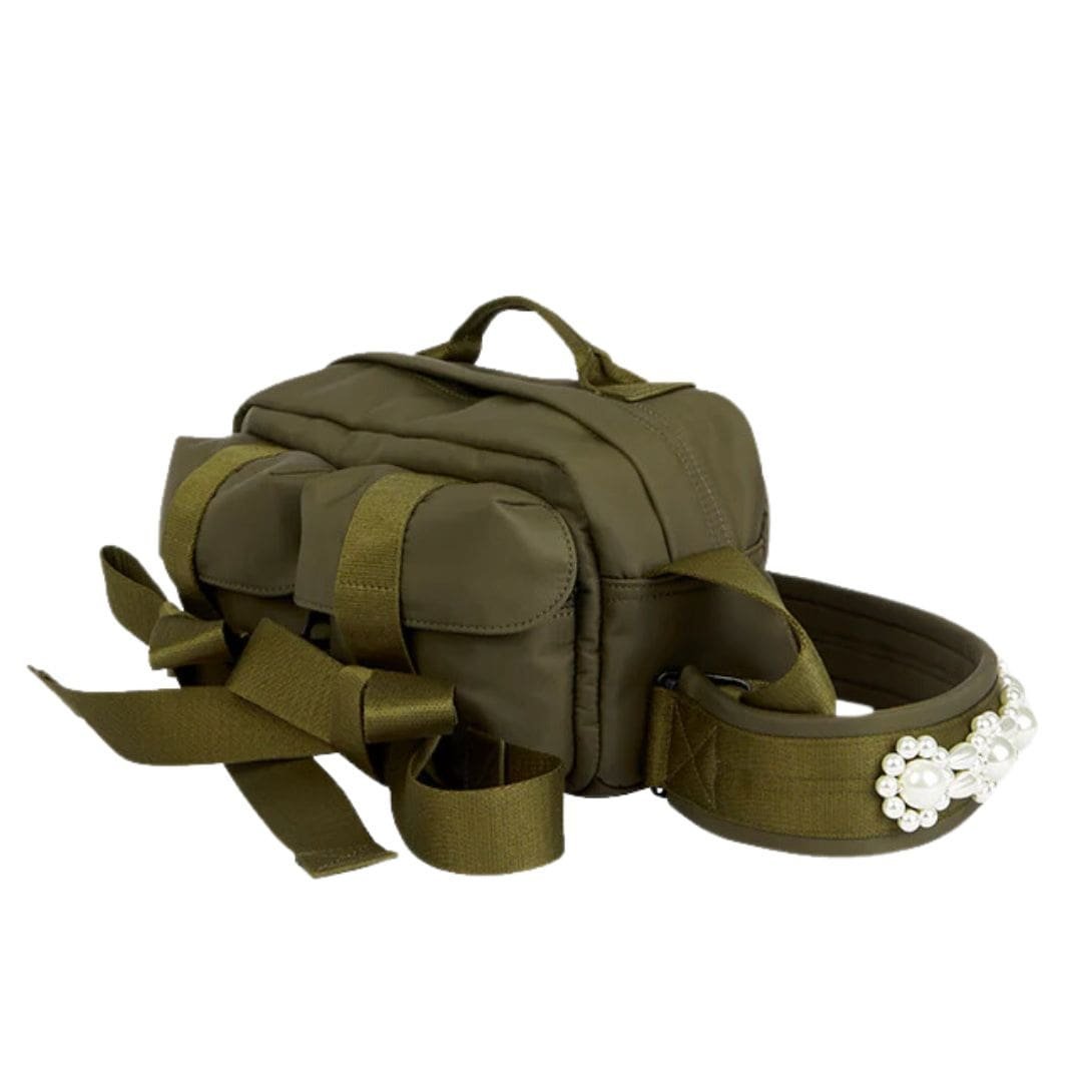 Introducing the  olive green La Garconne Simone Rocha Bow Crossbody Bum Bag adorned with floral beaded embellishment crafted from nylon.