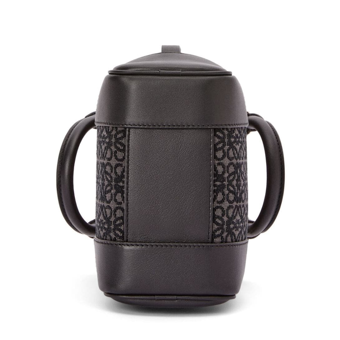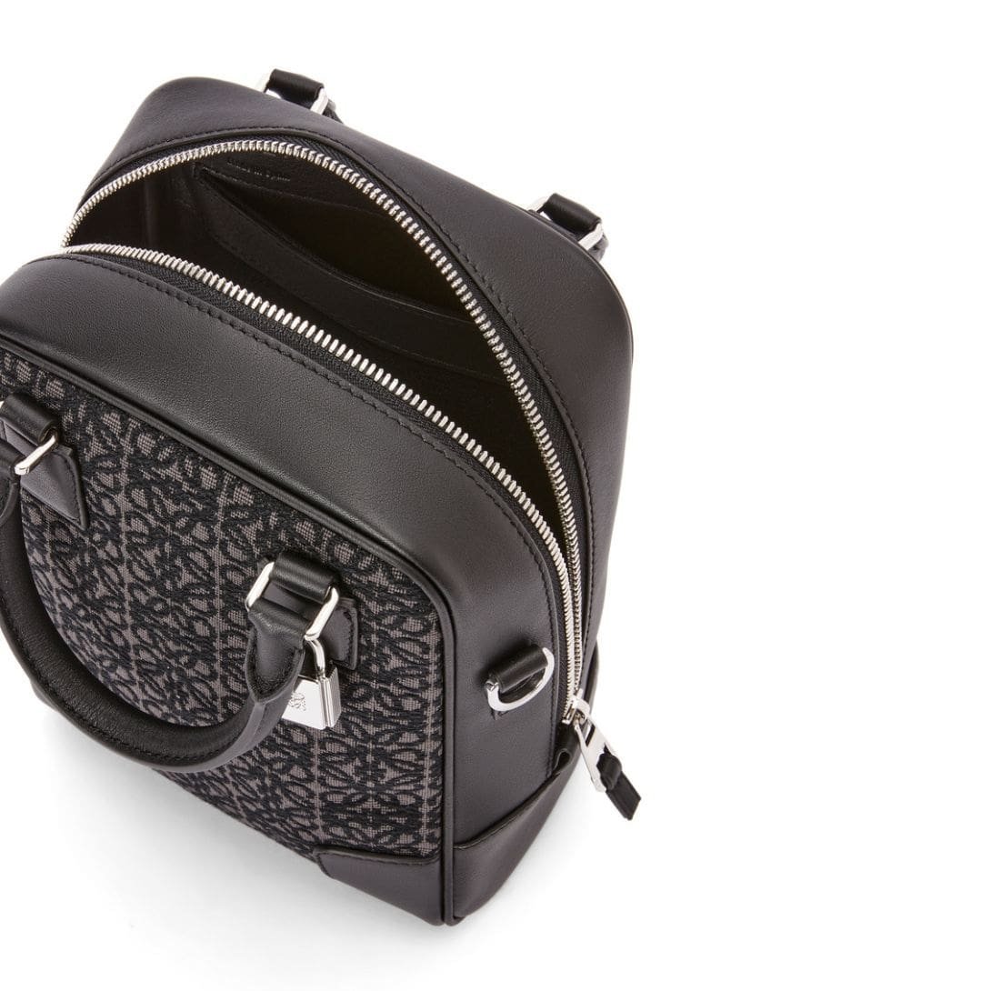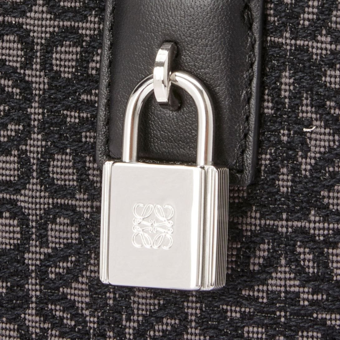 Loewe Amazona 15 Bag In Anagram Jacquard And Calfskin sophisticated accessory, presented in a chic anthracite and black color scheme, is crafted from a luxurious combination of jacquard and calf leather. The blend of materials not only enhances its aesthetic appeal but also ensures durability and a refined texture.