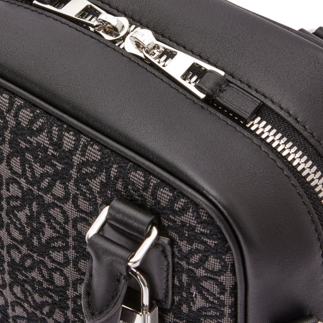 In summary, this anthracite and black jacquard and calf leather bag offers a perfect blend of style and functionality. The adjustable shoulder strap and convenient handle provide versatile carrying options, while its lightweight and well-proportioned dimensions make it ideal for daily use. Whether for work, travel, or leisure, this bag is a sophisticated and practical companion, showcasing fine craftsmanship and timeless elegance.