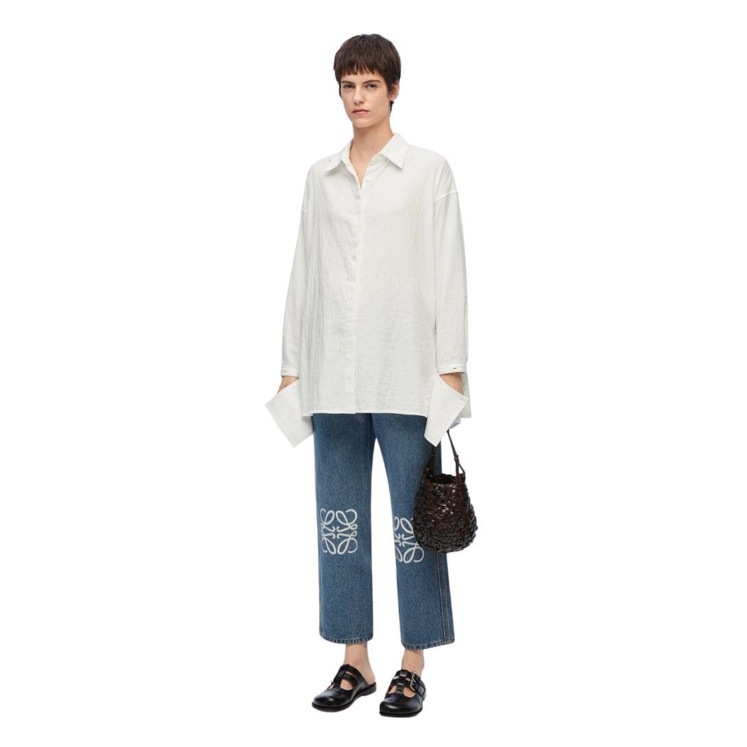 Ideal for the fashion-forward individual, Loewe’s Anagram Baggy Jeans in white cotton combine casual elegance with contemporary style. Their lightweight feel, breathable fabric, and versatile color make them a go-to choice for enhancing any wardrobe with a touch of refined simplicity and urban flair.