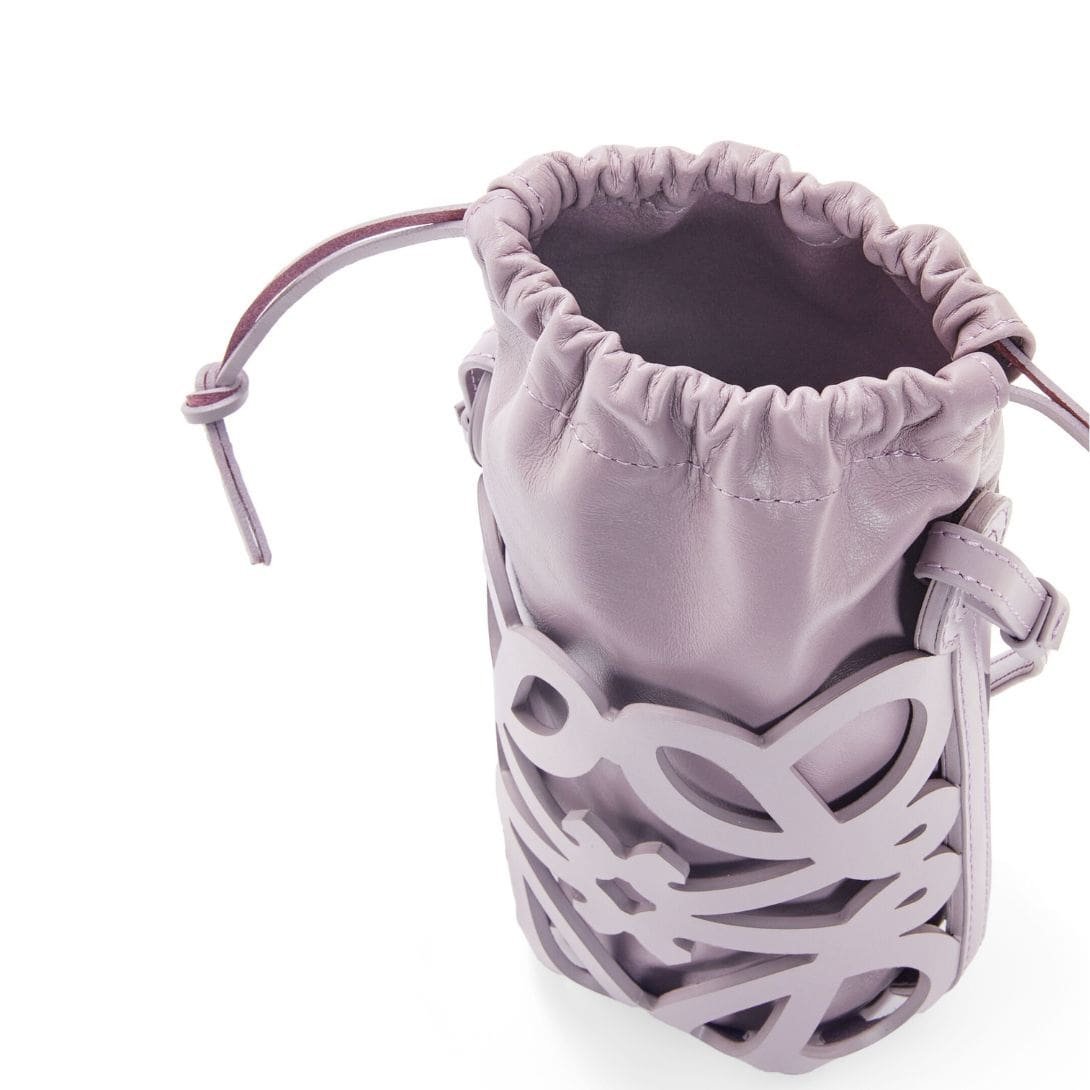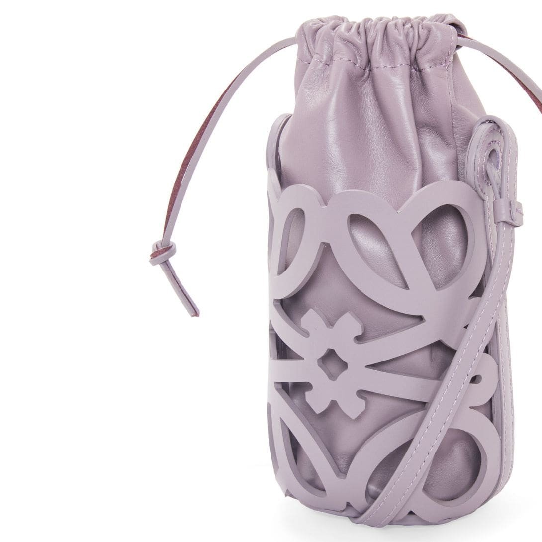 Loewe Anagram Cut Out Bag In Classic Calfskin And Nappa, presented in a sophisticated Pale Aubergine Glaze color, is crafted from a luxurious combination of calf leather and nappa. This blend of materials ensures a soft, supple texture while providing durability and a refined appearance. The rich hue and quality materials make it a versatile accessory suitable for both casual and formal occasions.