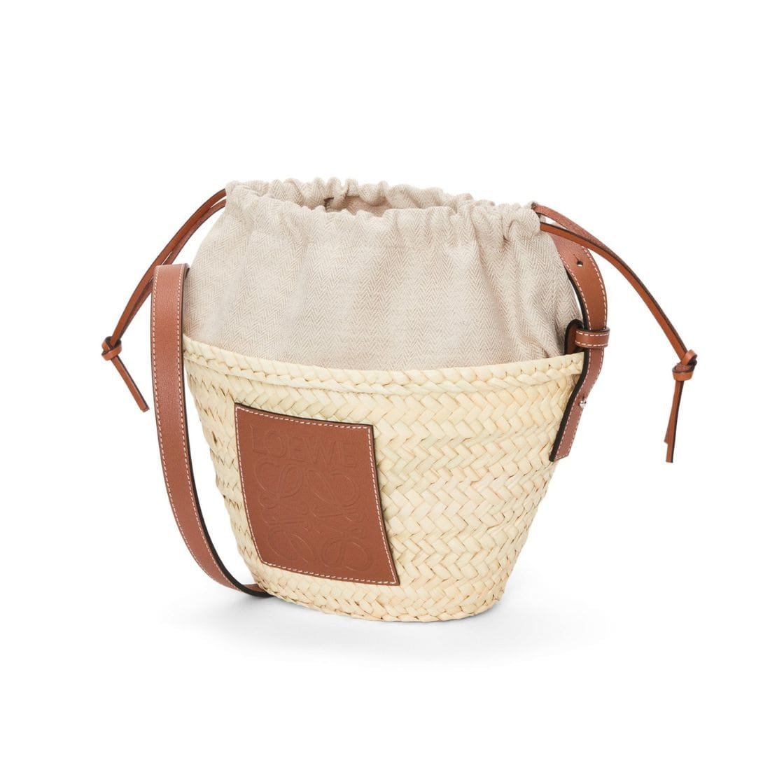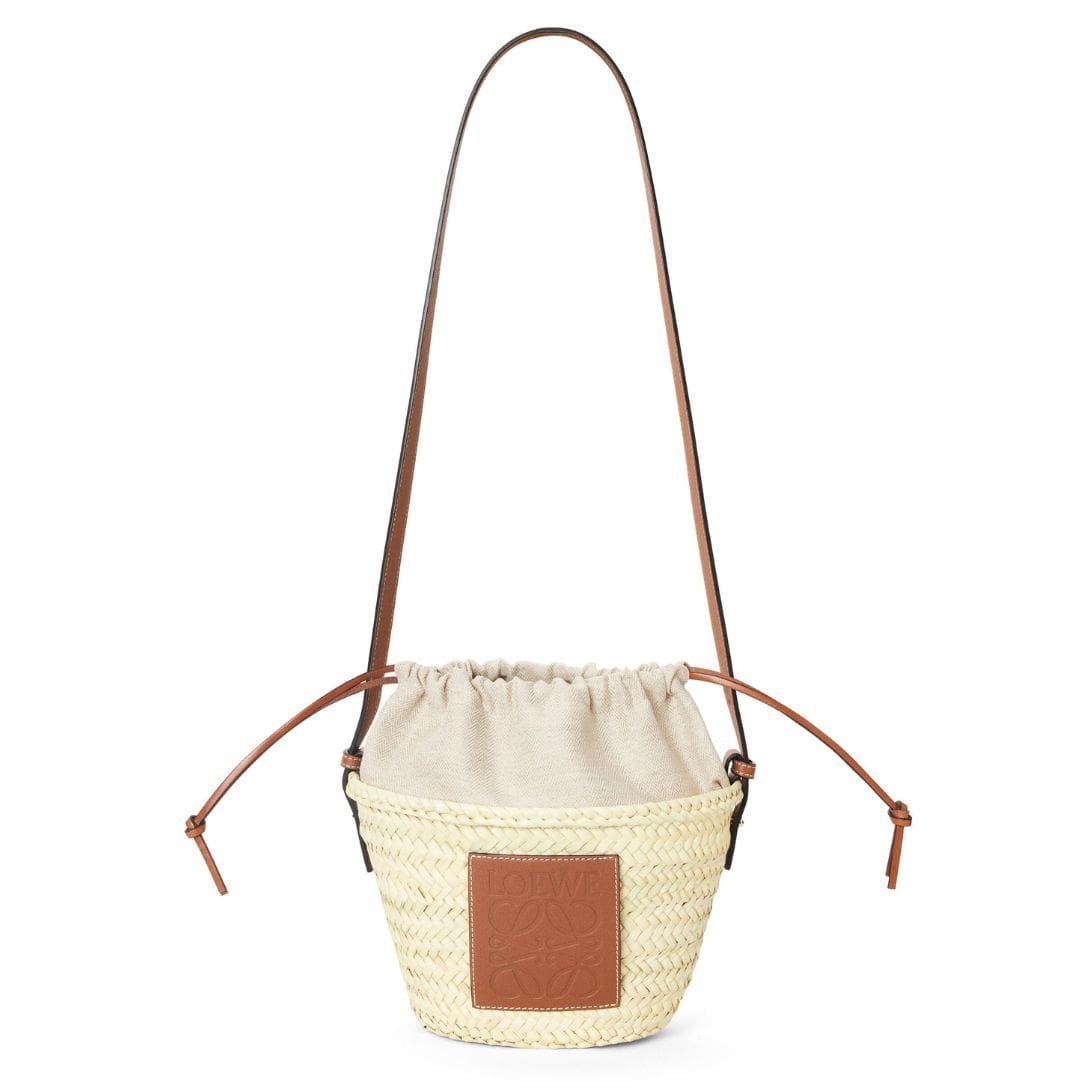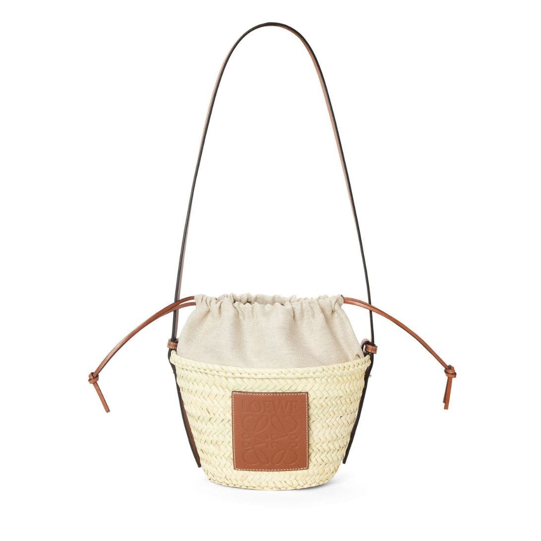 This chic accessory features a natural and tan color scheme, exuding a relaxed yet sophisticated vibe. Crafted from Loewe Bucket Bag With Drawstring In Palm Leaf And Calfskin leather, it blends organic texture with refined luxury, making it a standout piece in any collection.