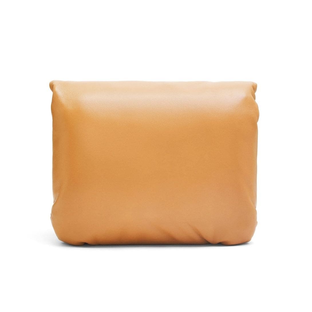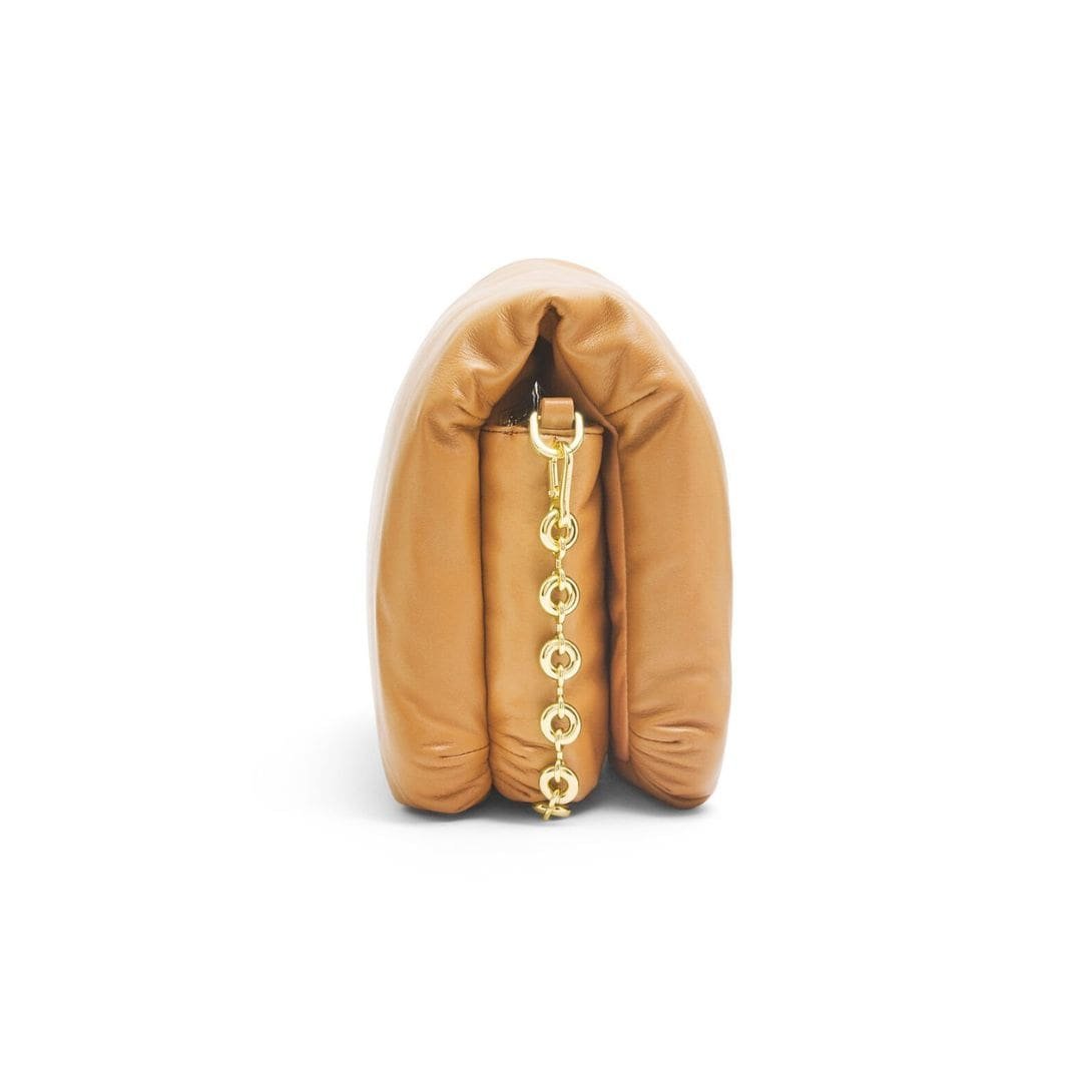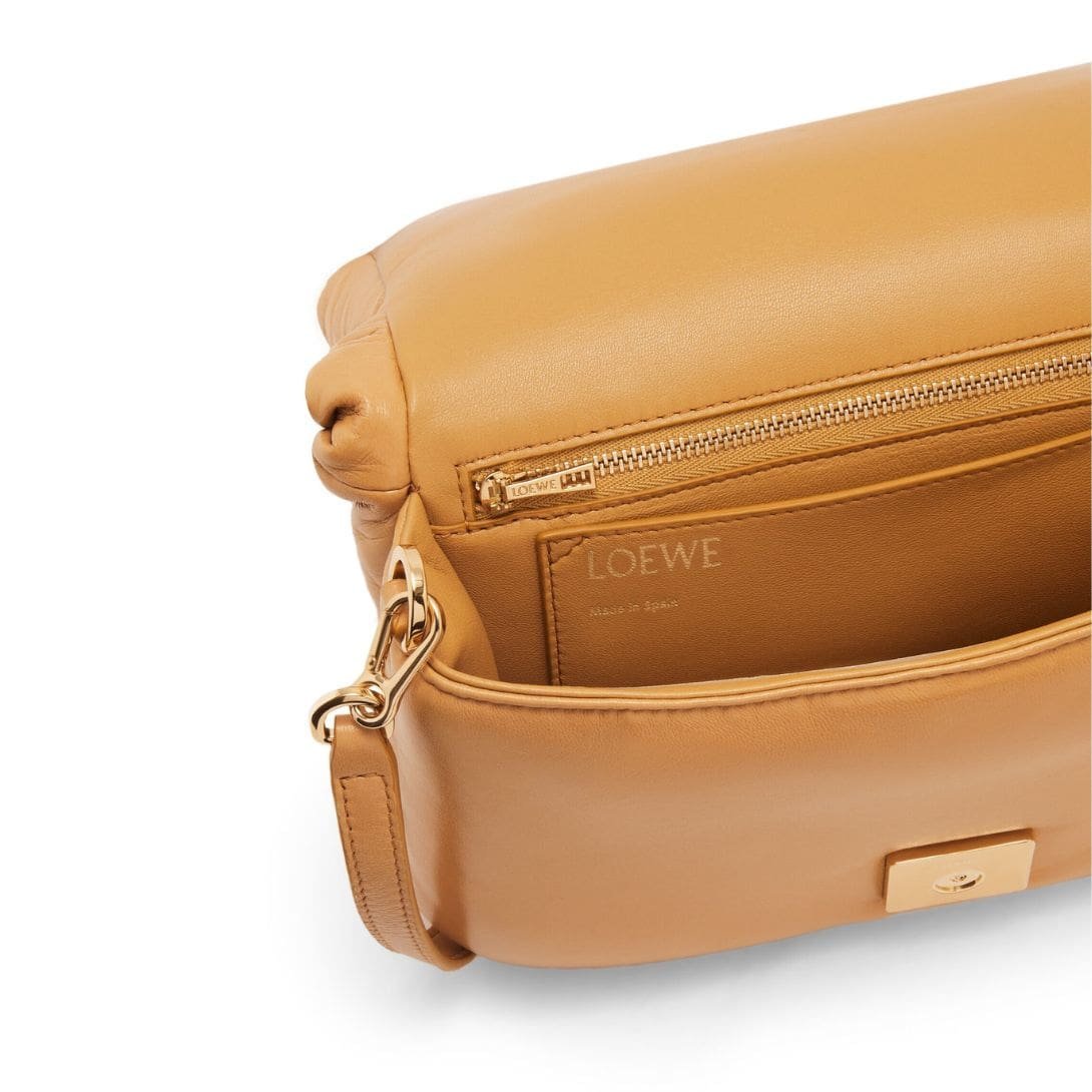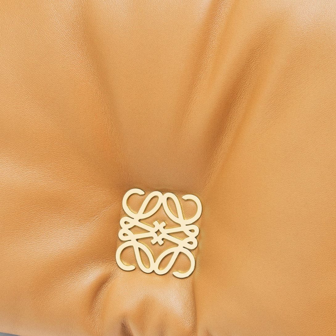 The LOEWE Goya Puffer Bag In Shiny Lambskin is a chic and sophisticated accessory, crafted from polished calf nappa leather. This premium material provides a sleek, shiny finish that exudes elegance and durability, making it a standout piece in any wardrobe.
