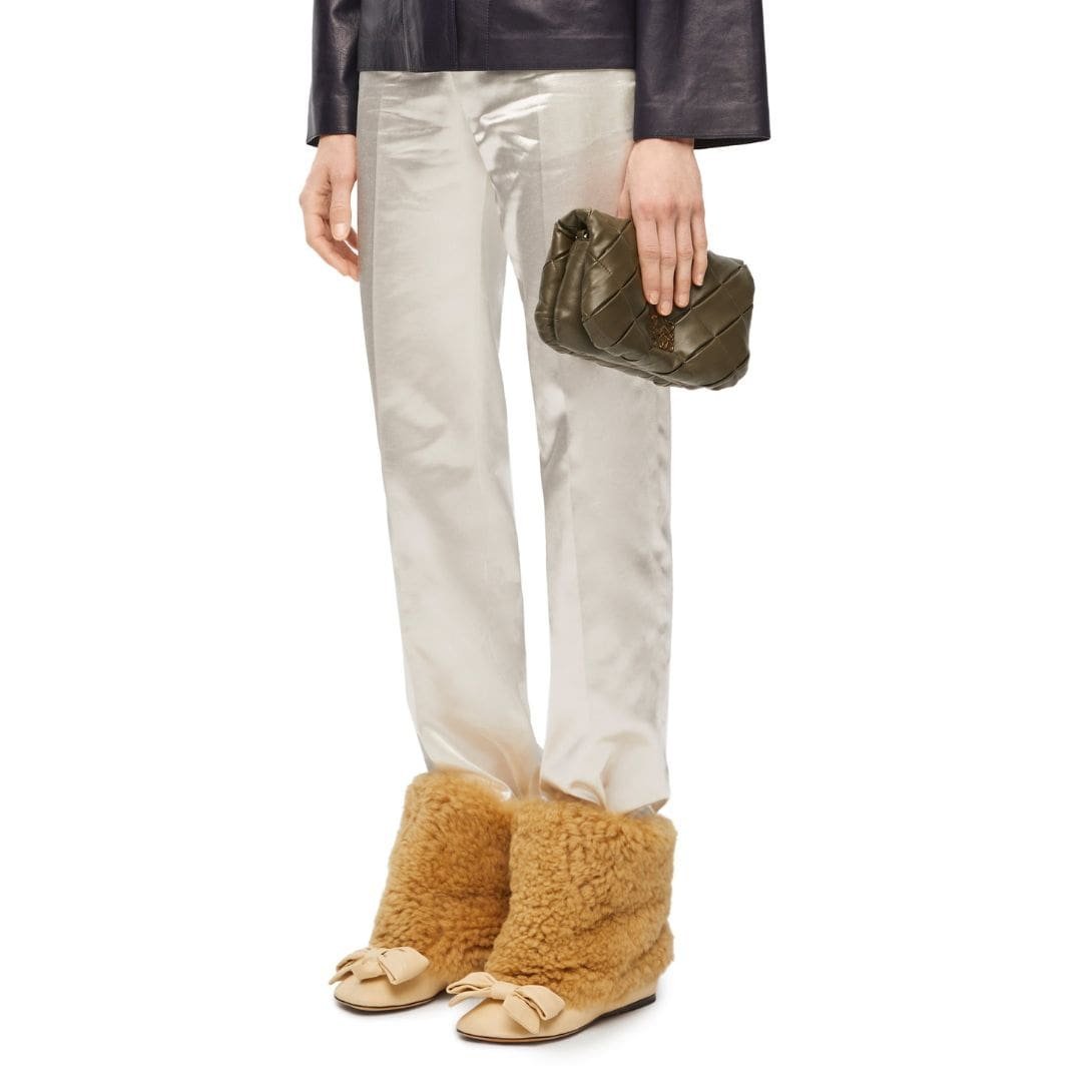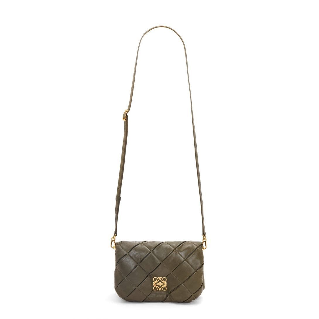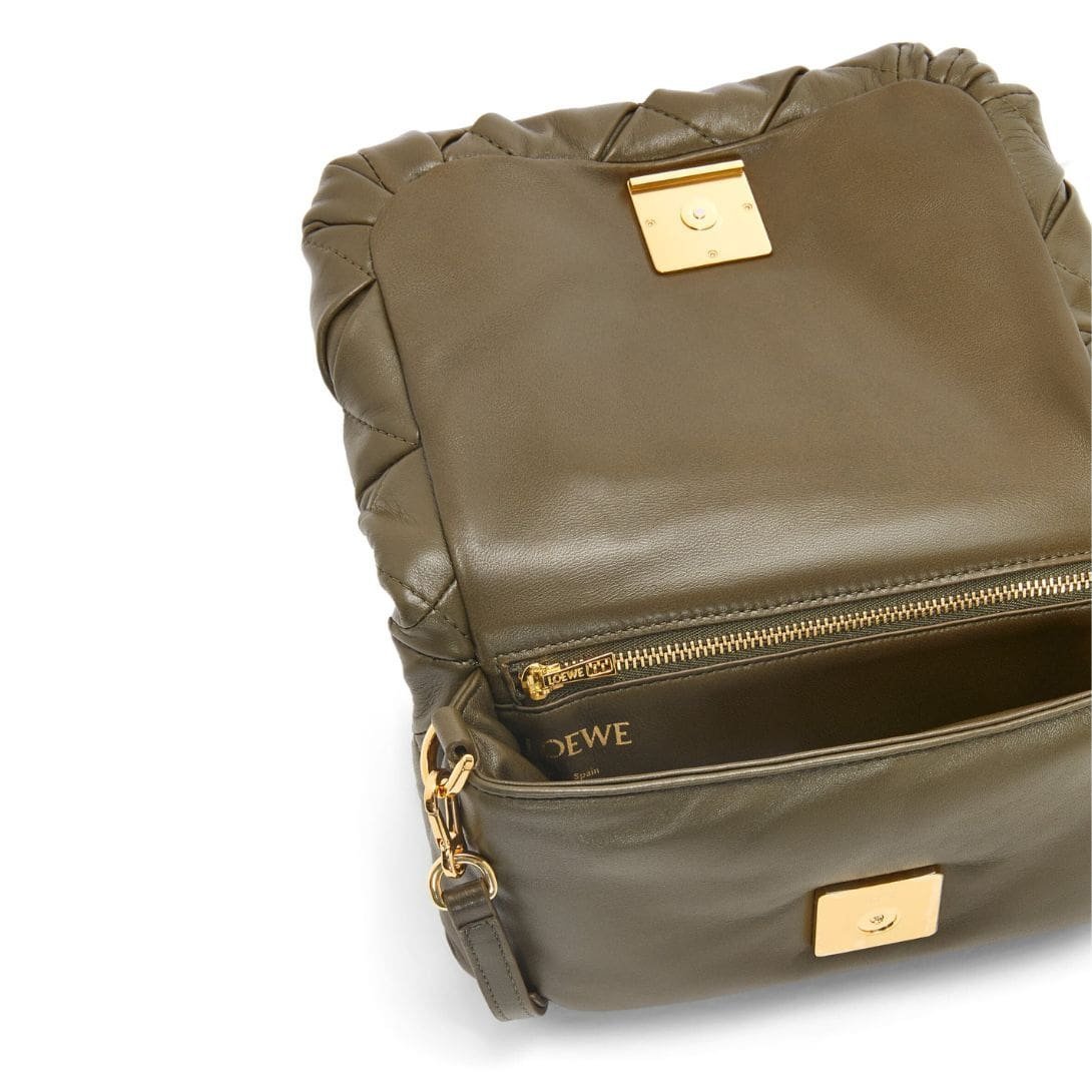 The LOEWE Goya Puffer Mini Bag In Shiny Lambskin is a chic and sophisticated accessory, crafted from polished calf nappa leather. This premium material provides a sleek, shiny finish that exudes elegance and durability, making it a standout piece in any wardrobe.
