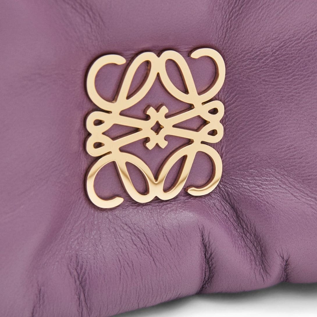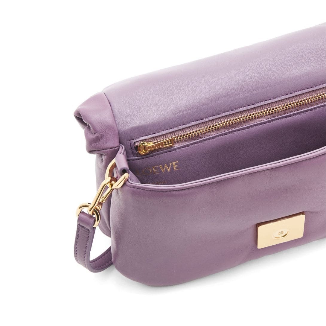 The LOEWE Goya Puffer Mini Bag In Shiny Lambskin is a chic and sophisticated accessory, crafted from polished calf nappa leather. This premium material provides a sleek, shiny finish that exudes elegance and durability, making it a standout piece in any wardrobe.