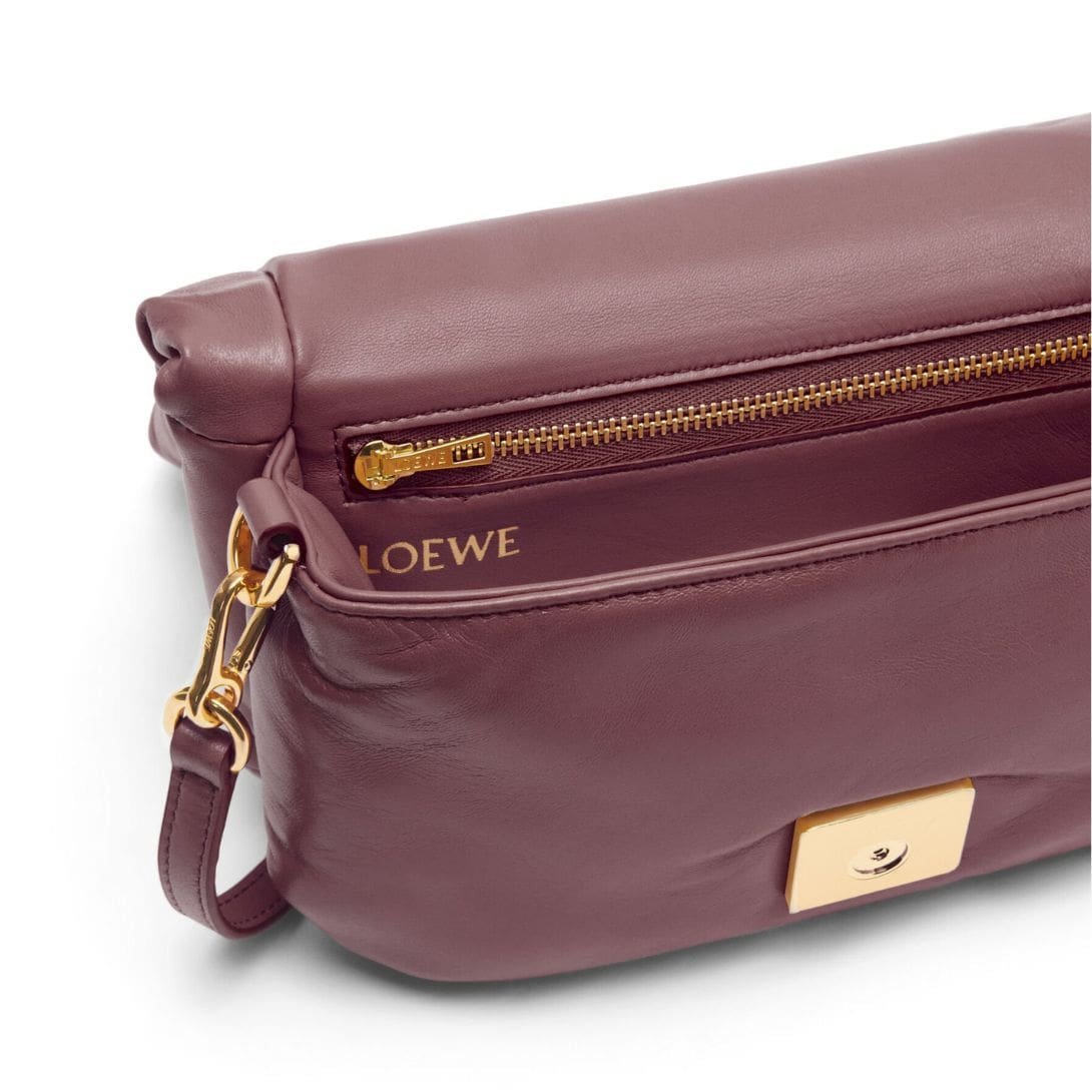 The minimalist yet striking design of the Goya Puffer Bag is complemented by LOEWE’s renowned craftsmanship. The polished calf nappa leather exterior is accentuated by precise stitching and high-quality hardware, reflecting the brand’s commitment to superior design and construction. Inside, the bag features well-organized compartments, ensuring your belongings are kept neatly and securely.