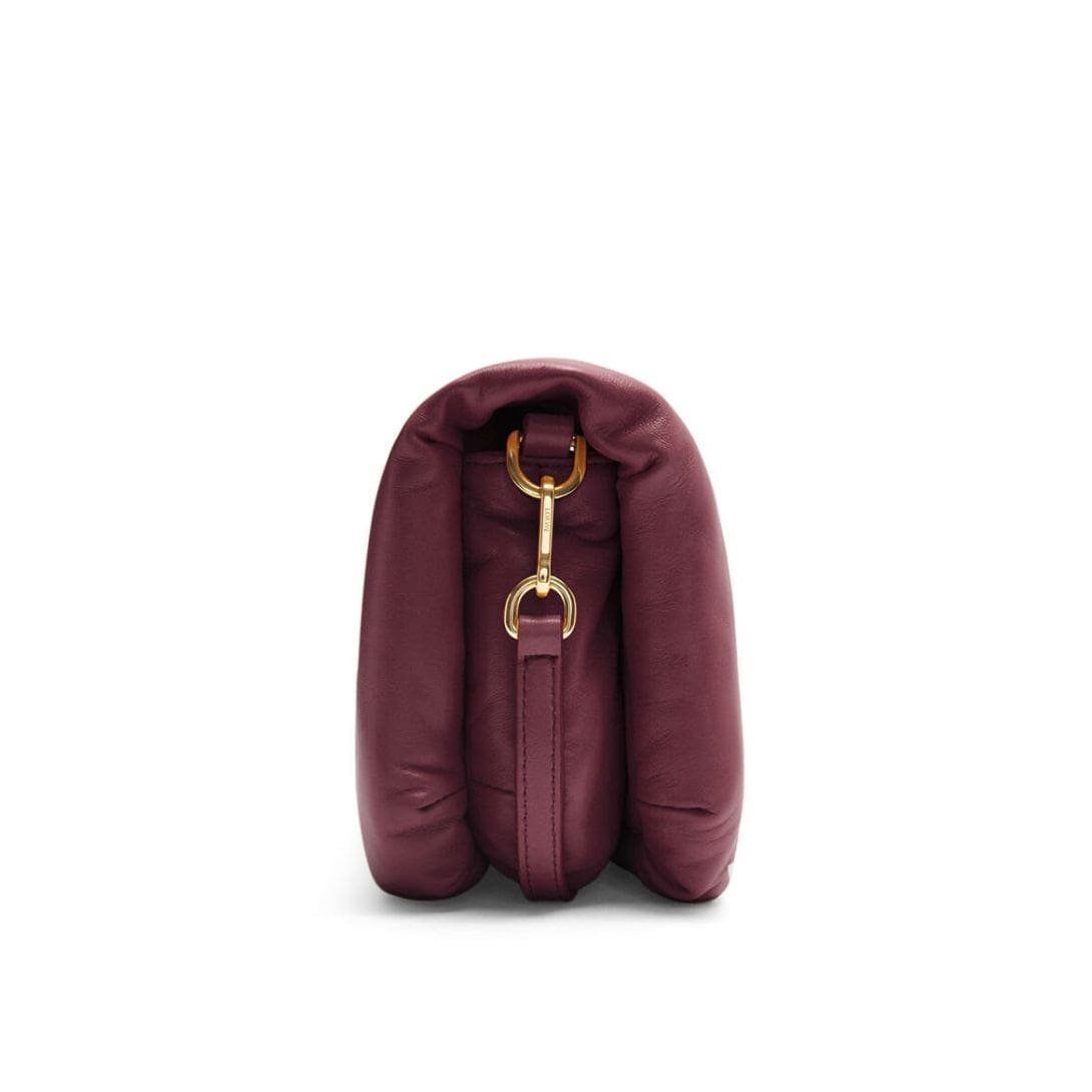 The LOEWE Goya Puffer Mini Bag In Shiny Lambskin is a chic and sophisticated accessory, crafted from polished calf nappa leather. This premium material provides a sleek, shiny finish that exudes elegance and durability, making it a standout piece in any wardrobe.