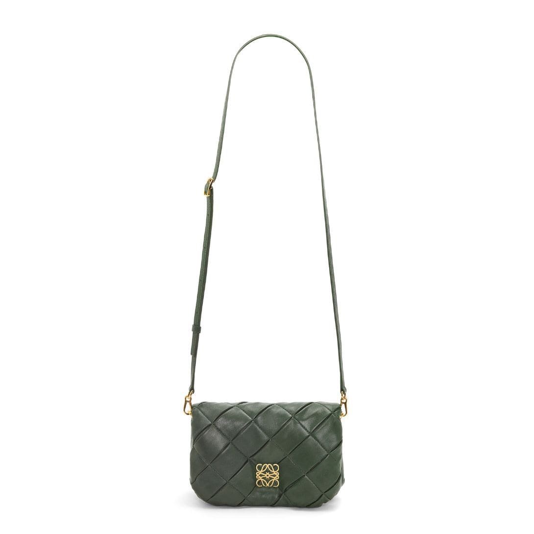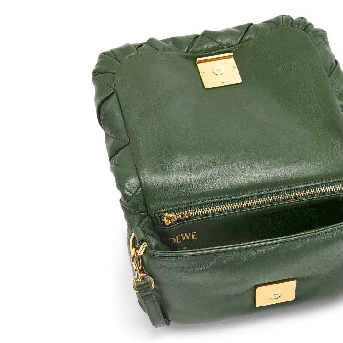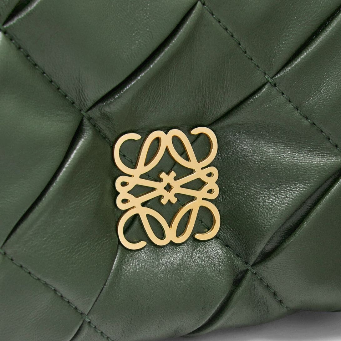 The LOEWE Goya Puffer Mini Bag In Shiny Lambskin is a chic and sophisticated accessory, crafted from polished calf nappa leather. This premium material provides a sleek, shiny finish that exudes elegance and durability, making it a standout piece in any wardrobe.
