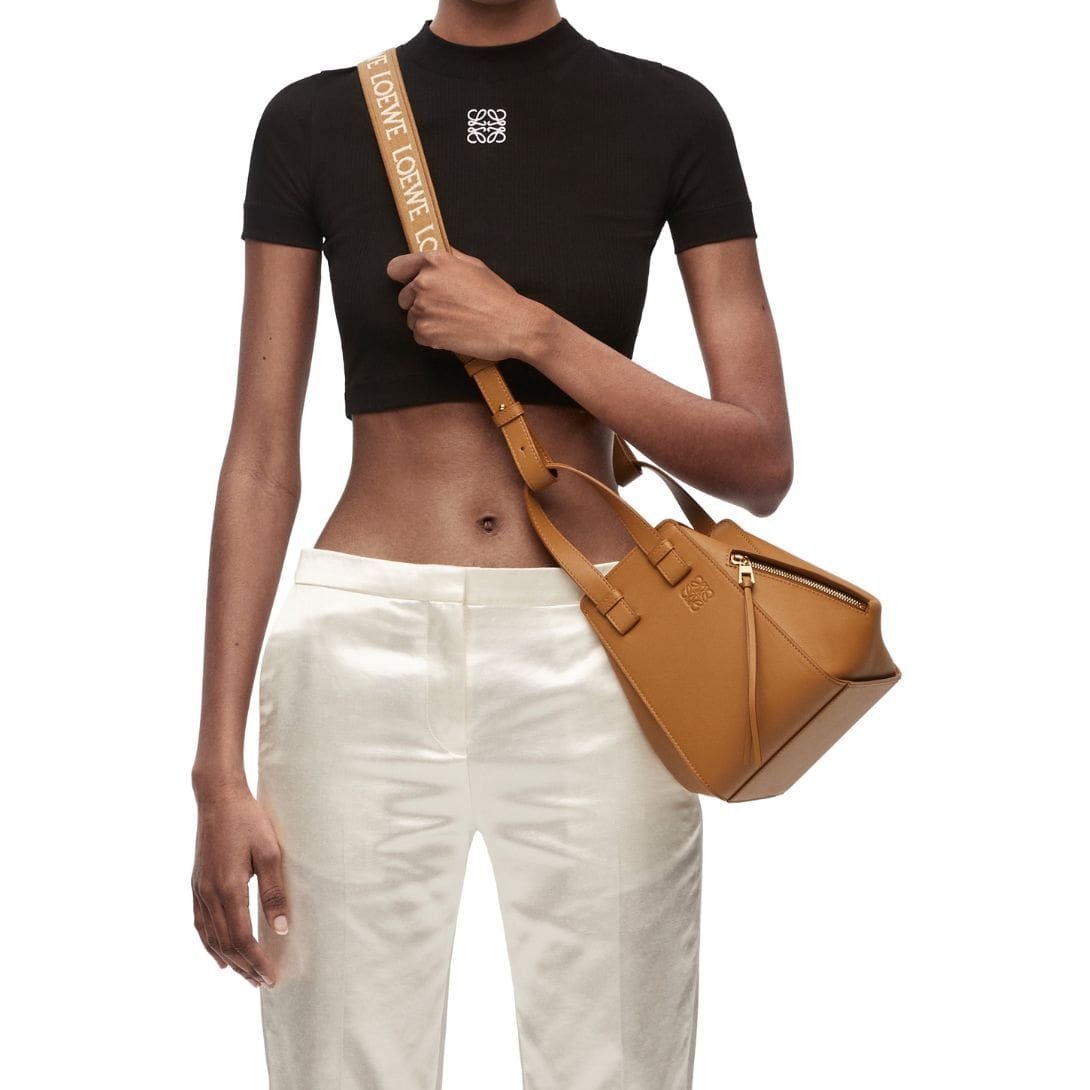 The sleek design of the Hammock Compact Bag is further accentuated by LOEWE’s impeccable craftsmanship. The satin calf leather exterior is complemented by precise stitching and high-quality hardware, reflecting the brand’s commitment to superior design and construction. Inside, the bag features well-organized compartments, ensuring your belongings are kept neatly and securely.
