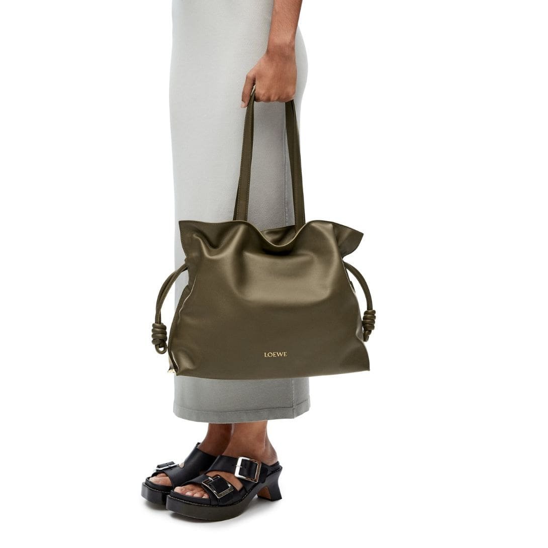 In summary, the LOEWE Large Flamenco Clutch Bag in Calfskin Nappa is a luxurious and practical accessory. Made from premium calf nappa leather, it features a 29 cm handle drop and weighs 0.64 kg. With dimensions of 29 cm (11.4 inches) in height, 38 cm (15 inches) in width, and 14 cm (5.5 inches) in depth