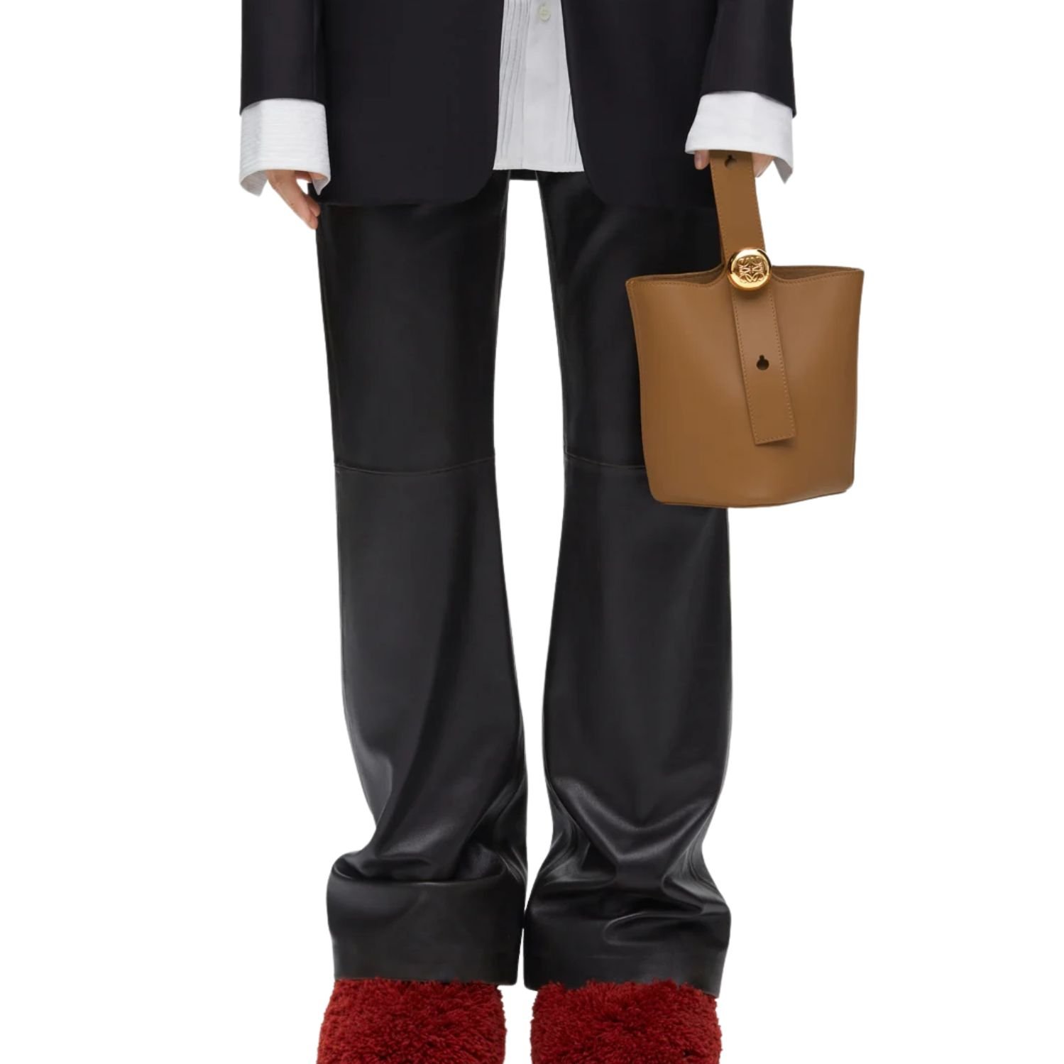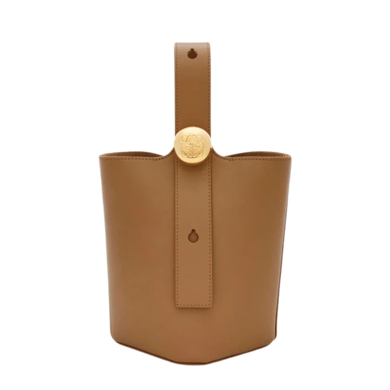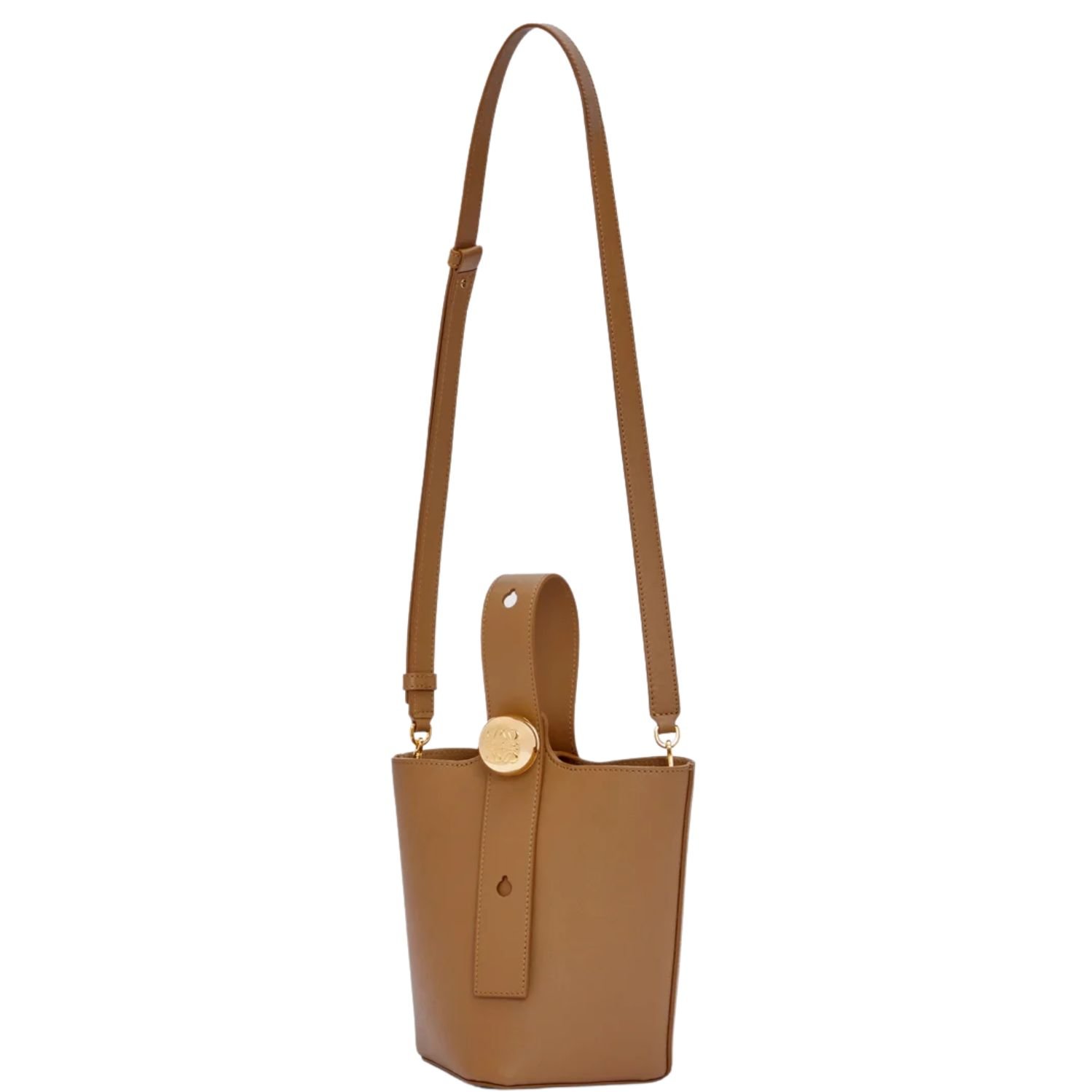 Sleek, sculptural, and effortlessly modern, the Loewe Pebble Mini Bucket Bag captures the essence of minimalist design elevated by craftsmanship. Expertly crafted in smooth calfskin, this compact silhouette is defined by its wide leather strap, elegantly threaded through a bold, oversized Pebble closure—a statement of both form and function.