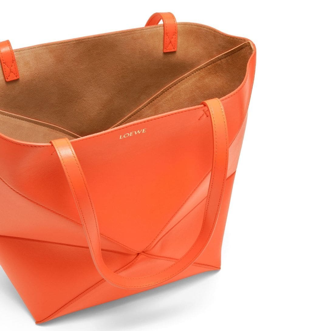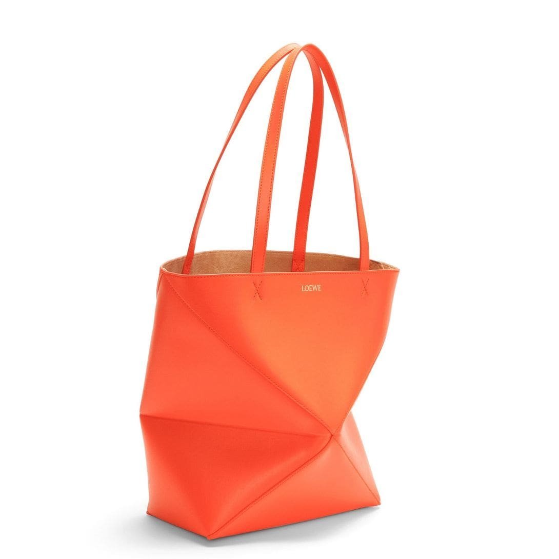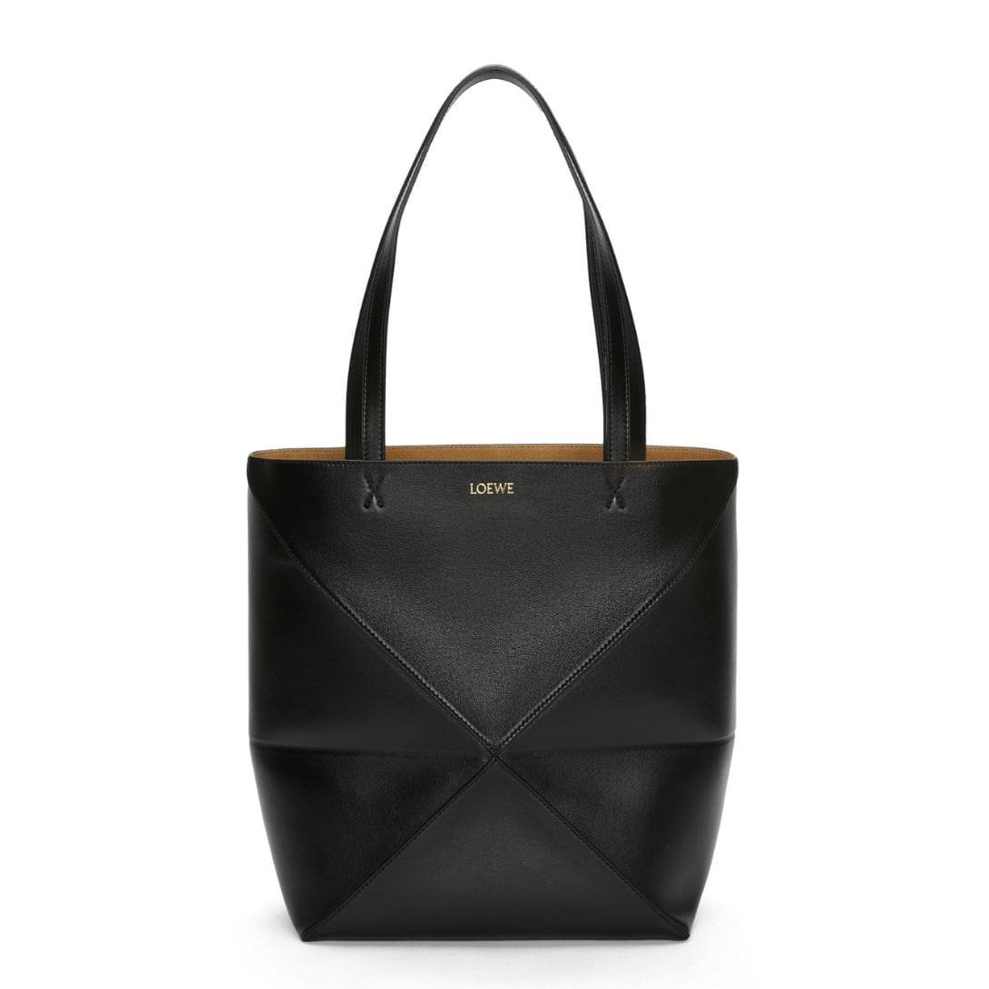 Indulge in luxury with the exquisite craftsmanship of the LOEWE Puzzle Fold Tote Bag In Shiny Calfskin, crafted from polished calf leather. This sophisticated accessory is both timeless and versatile, embodying the epitome of elegance.
