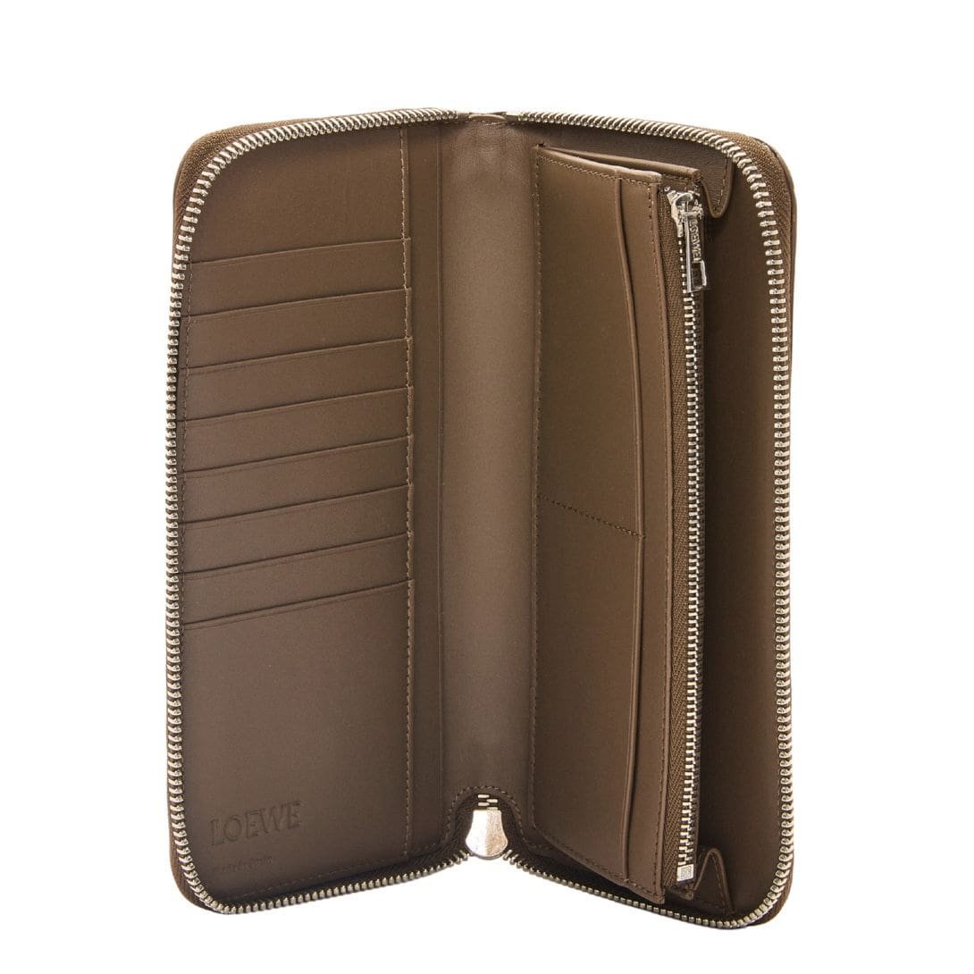 The classic calfskin leather exemplifies Loewe’s commitment to craftsmanship, featuring meticulous stitching and a refined finish. Inside, the wallet includes multiple compartments and slots for efficient organization, ensuring easy access to belongings while maintaining security.