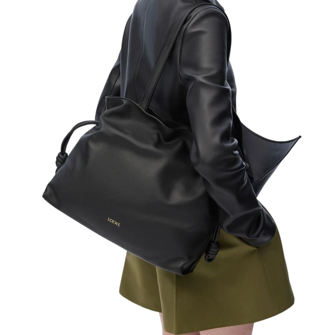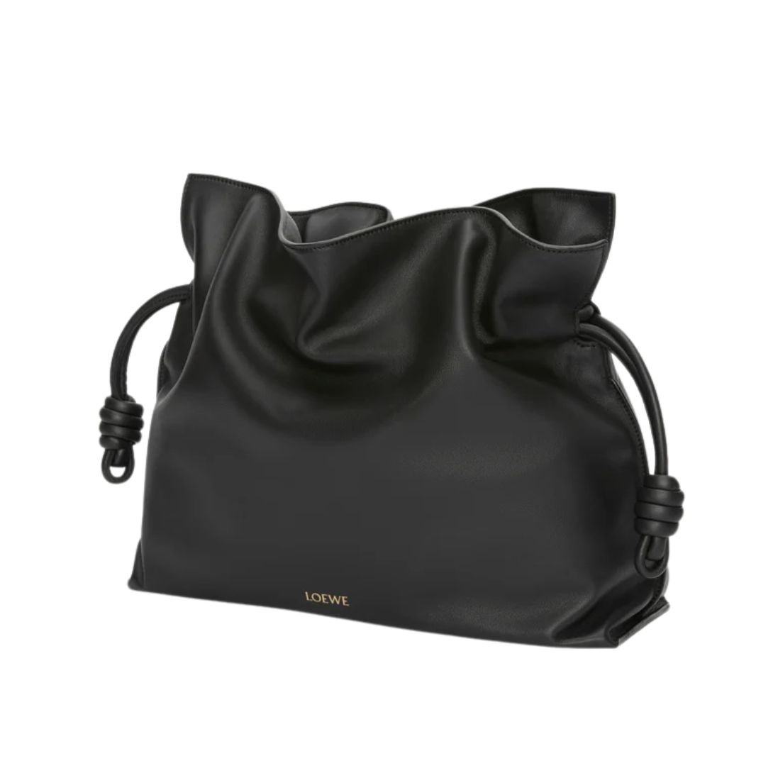 Sculptural yet effortlessly relaxed, the Loewe Flamenco Large Clutch reimagines a classic silhouette with modern versatility. Crafted from supple nappa calfskin, this oversized version of the Flamenco features a cinched design, iconic knot drawstrings, and a beautifully slouchy form that moves with you.