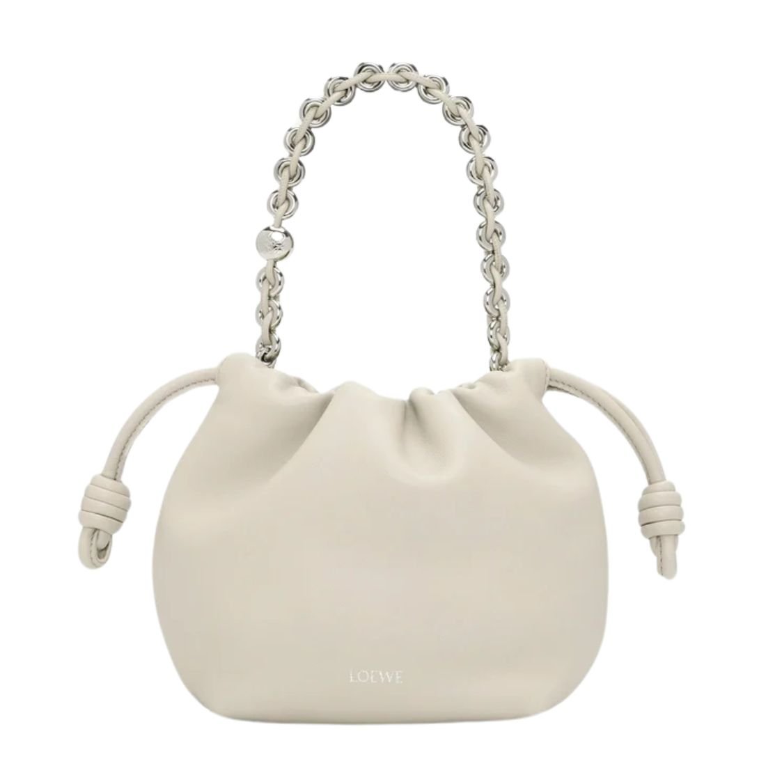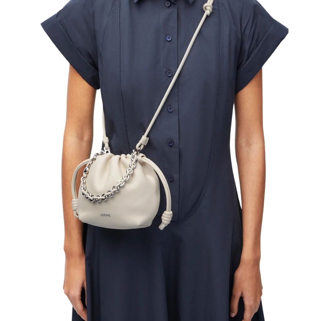 A playful yet refined statement piece, the Loewe Flamenco Mini Purse is defined by its signature ruched silhouette and knotted drawstrings—paying homage to the brand’s heritage craftsmanship. This mini version, crafted in mellow nappa lambskin, offers a soft, tactile experience with a modern edge.