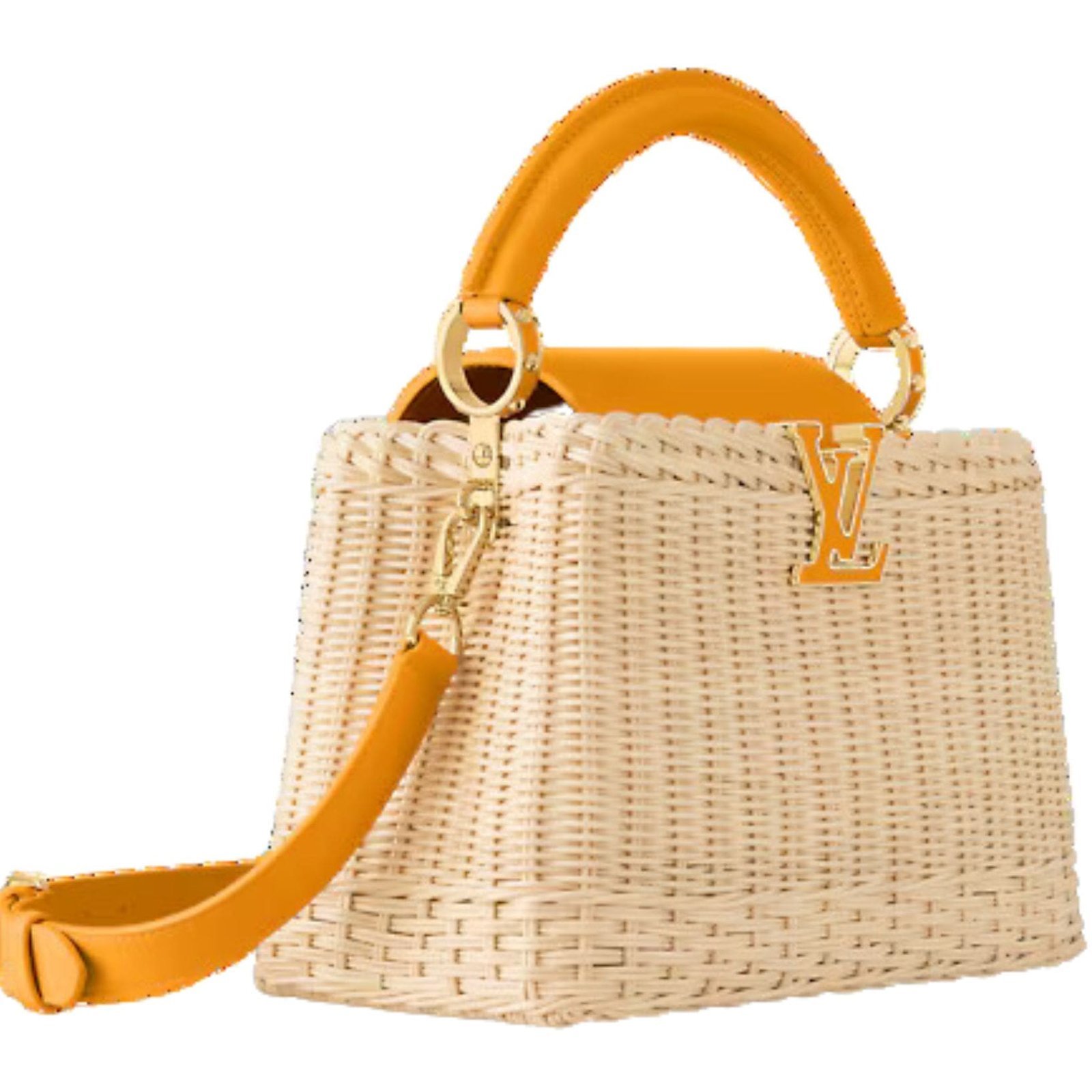 Introducing the timeless elegance of the LOUIS VUITTON CAPUCIINES BB handbag, reminiscent of Louis Vuitton’s iconic Picnic Trunk from 1892. Crafted with meticulous attention to detail, this exquisite piece features a body crafted from braided rattan, accentuated with cowhide leather on the top handle and flap. The hardware, including the iconic LV Initials, gleams in a golden hue, adding a touch of opulence to the design.
