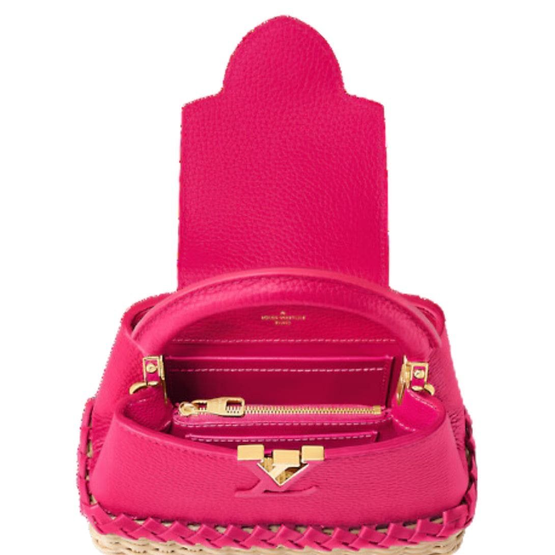 Introducing the exquisite LOUIS VUITTON CAPUCIINES MINI handbag, a masterpiece crafted with precision and finesse, marrying luxurious Taurillon leather with a base intricately woven from braided rattan. This fusion of materials showcases the House’s unparalleled expertise in hand-braiding natural fibers, elevating the iconic Capucines design to new heights of sophistication.