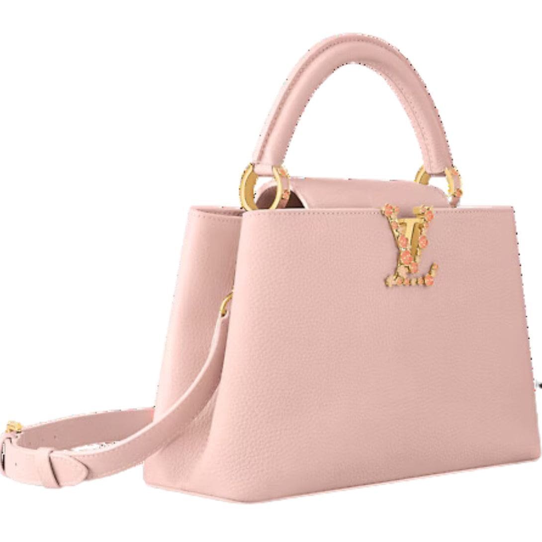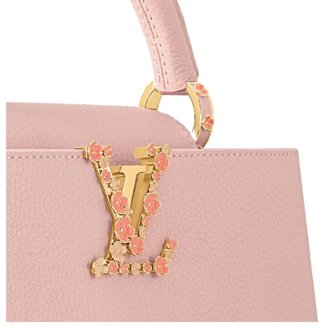 Introducing the captivating LOUIS VUITTON CAPUCIINES MM handbag, a delightful ode to spring with exquisite floral embellishments. Crafted from luxurious full-grain Taurillon leather in a soft blush hue, this meticulously crafted edition is adorned with enamel blossoms meticulously hand-painted and -welded to the iconic LV signature. Additional blooms grace the golden handle mounts, adding a touch of whimsical charm to this elegant piece.