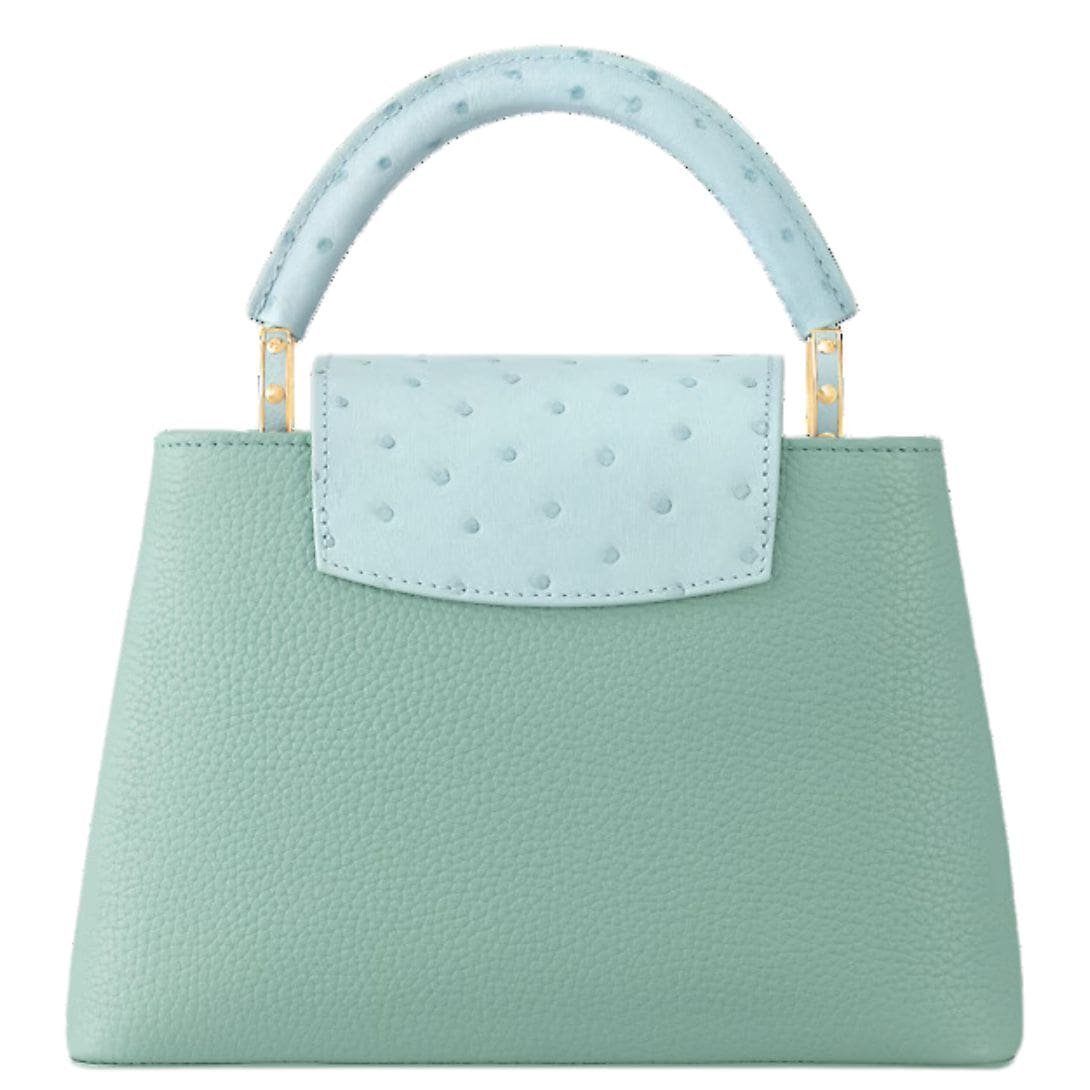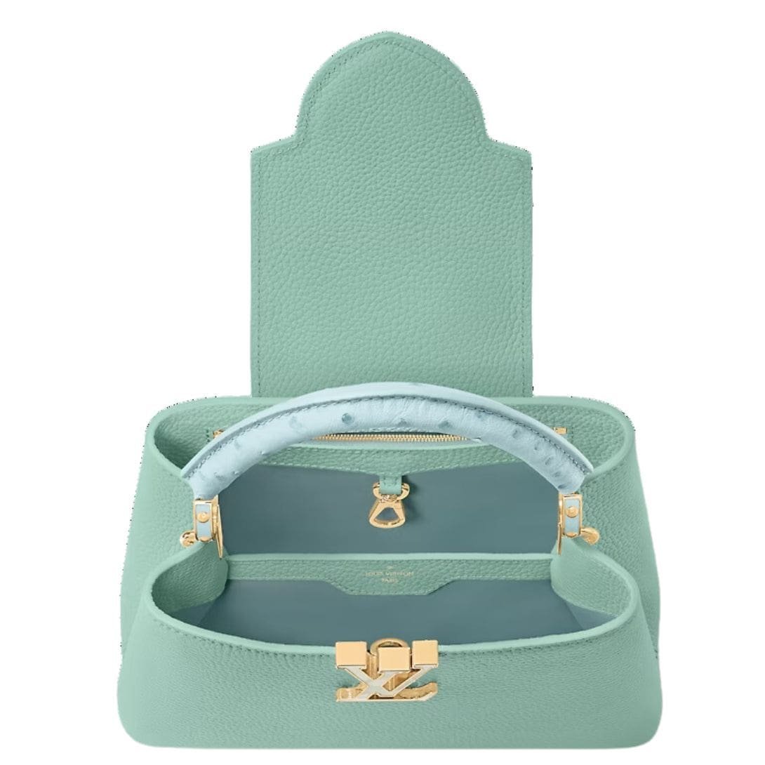 Crafted from premium full-grain Taurillon leather and elevated with luxurious ostrich-skin detailing, this pale-blue LOUIS VUITTON CAPUCINES BB handbag exudes understated elegance. The iconic LV signature, meticulously fashioned from lustrous mother-of-pearl, adds a subtle shimmer that enhances the bag’s sophisticated appeal. Despite its compact size, this handbag offers ample space, accommodating two smartphones, a long wallet, and other essential belongings with ease.