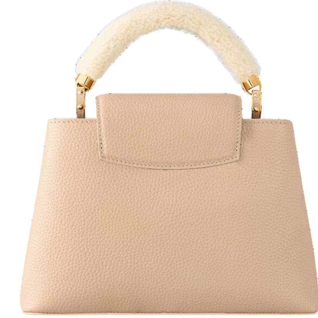 Introducing the wintry edition of the LOUIS VUITTON CAPUCINES BB handbag, a luxurious accessory that blends functionality with seasonal elegance. Crafted from rich Taurillon leather, this handbag features a cozy shearling top handle that adds a touch of winter charm. The decorative chain, interlaced with shearling and adorned with Monogram Blossoms made of enamel and gold-color metal, is both stylish and removable. Complementing the chain is a thin, adjustable strap, also removable, offering versatile carry options.