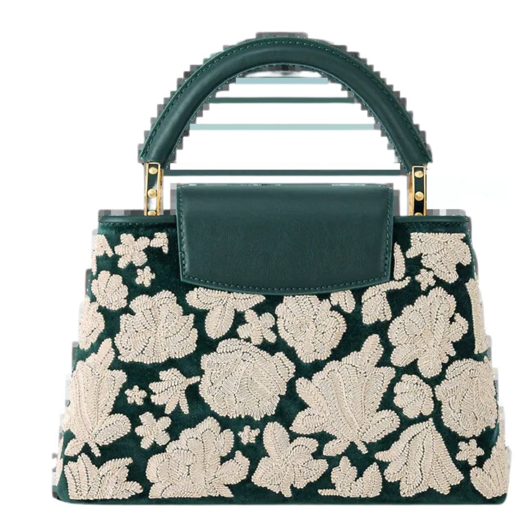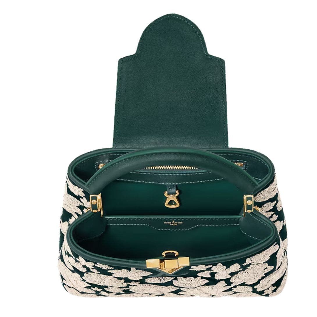 Inspired by the embroidery seen in this season’s Ready-To-Wear collection, the LOUIS VUITTON CAPUCINES BB handbag showcases a stunning baroque floral pattern crafted from finely embroidered lurex thread. This exquisite detail highlights Louis Vuitton’s exceptional craftsmanship and expertise. The handbag, in a sophisticated shade of green, combines luxurious velvet and lurex thread embroidery with calf-leather trim, offering a perfect blend of elegance and durability.