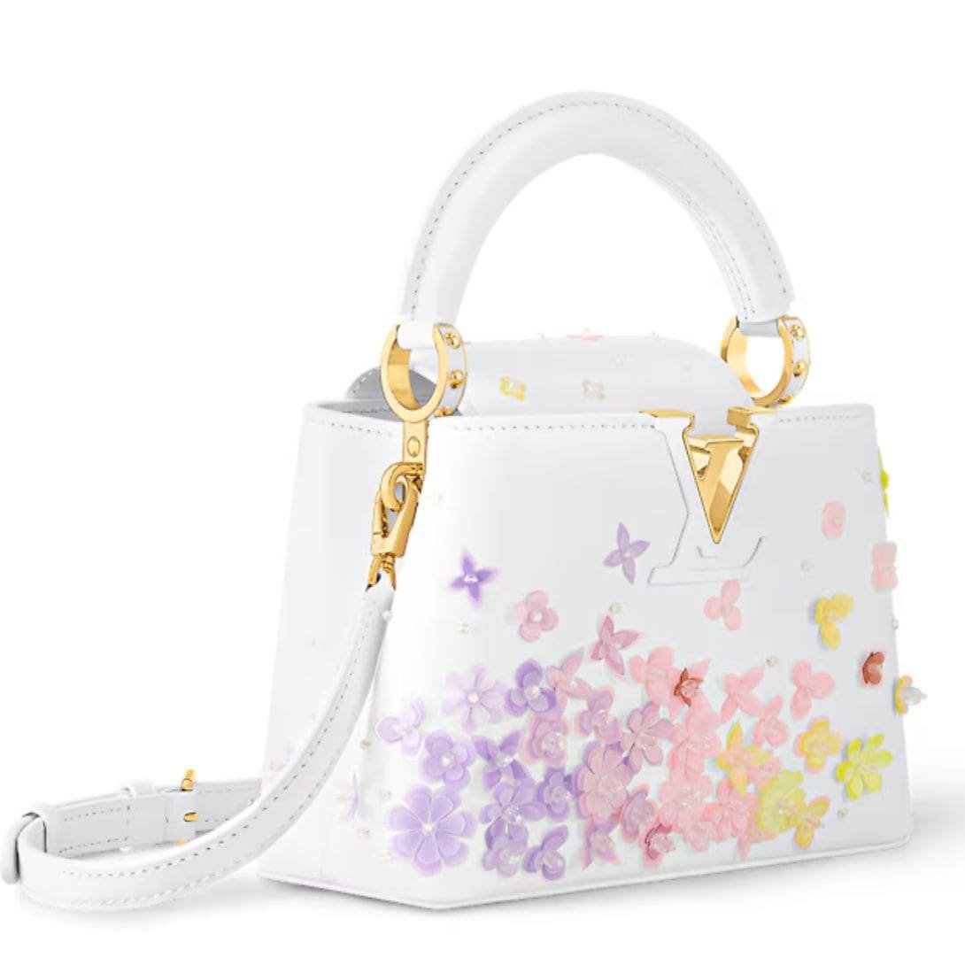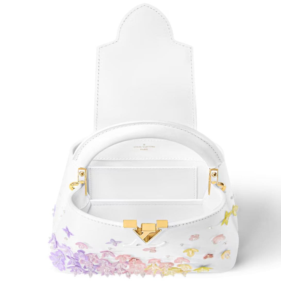 The LOUIS VUITTON CAPUCINES MINI handbag by Louis Vuitton is the epitome of artistic elegance and meticulous craftsmanship. Made from smooth calf leather in a pristine Optic White, this handbag is adorned with a delightful bubbly floral motif. Each flower is hand-crafted with sequins that are individually folded and attached to the leather with a bead, making each pearl the heart of every blossom. The multicolored flowers evoke the image of blossoms twirling gracefully in the wind, adding a playful yet sophisticated touch to the design.