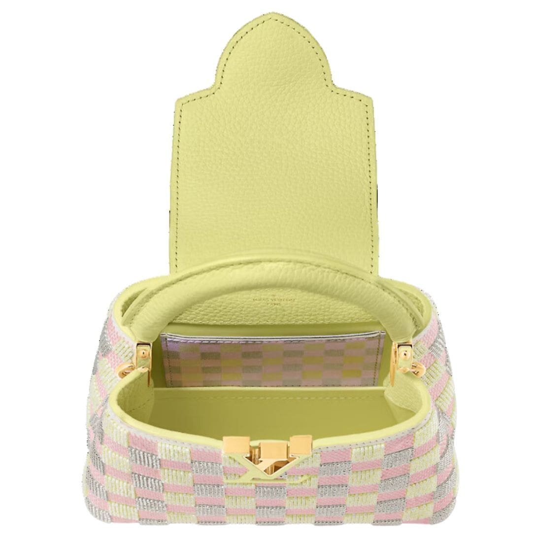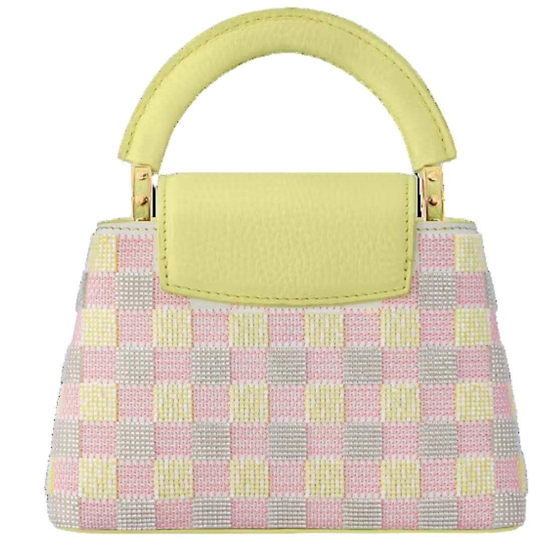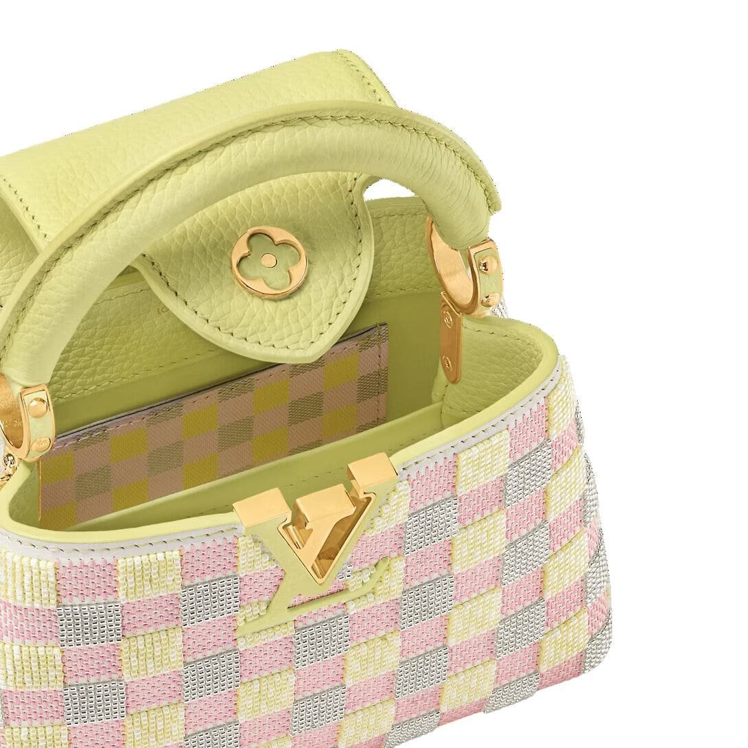 The LOUIS VUITTON CAPUCINES MINI handbag by Louis Vuitton brings high fashion to life with its smooth calfskin adorned with sparkling beads that form a chic checkerboard motif. The pastel colorway, complemented by a matching top handle and flap in a harmonious hue, adds a fresh and modern twist to this classic design. This versatile handbag includes a removable and adjustable braided chain, perfect for both shoulder and cross-body carry.