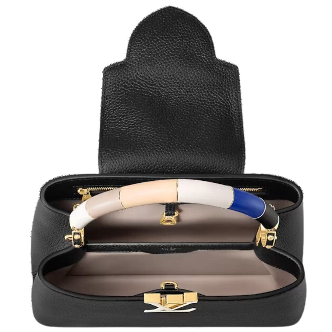 Inspired by the Japanese art of kintsugi, the LOUIS VUITTON CAPUCINES MINI handbag merges tradition with contemporary elegance. Crafted from full-grain Taurillon leather in a timeless black hue, this exquisite handbag showcases a unique, jewel-like handle. The handle is meticulously composed of upcycled leather in neutral tones, enhanced with delicate golden rings, creating a refined yet artful accent.