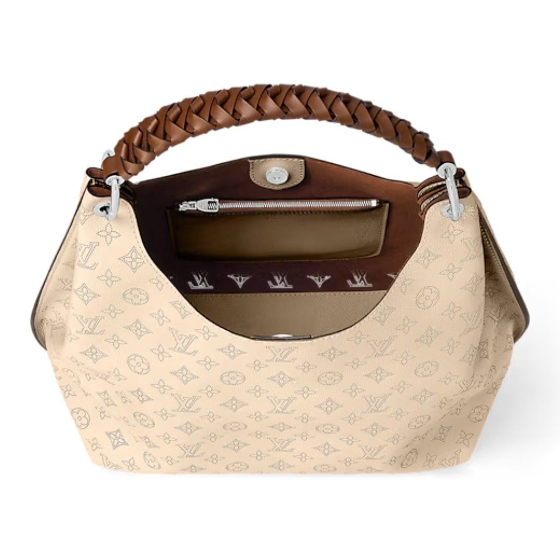 This hobo bag is designed with refined craftsmanship, highlighted by a braided leather handle that adds texture and sophistication. The removable LV leather charm further enhances its elegance, making this bag a standout accessory. The silver-tone hardware complements the soft tones of the bag for a polished finish.