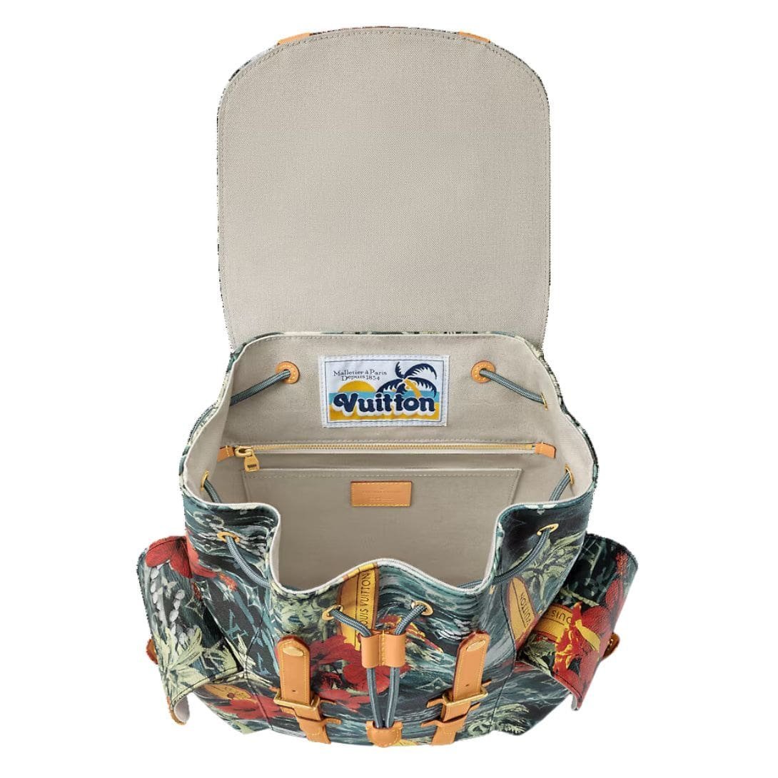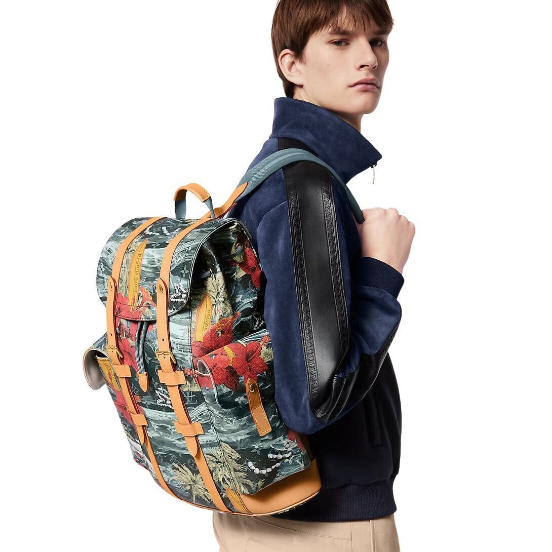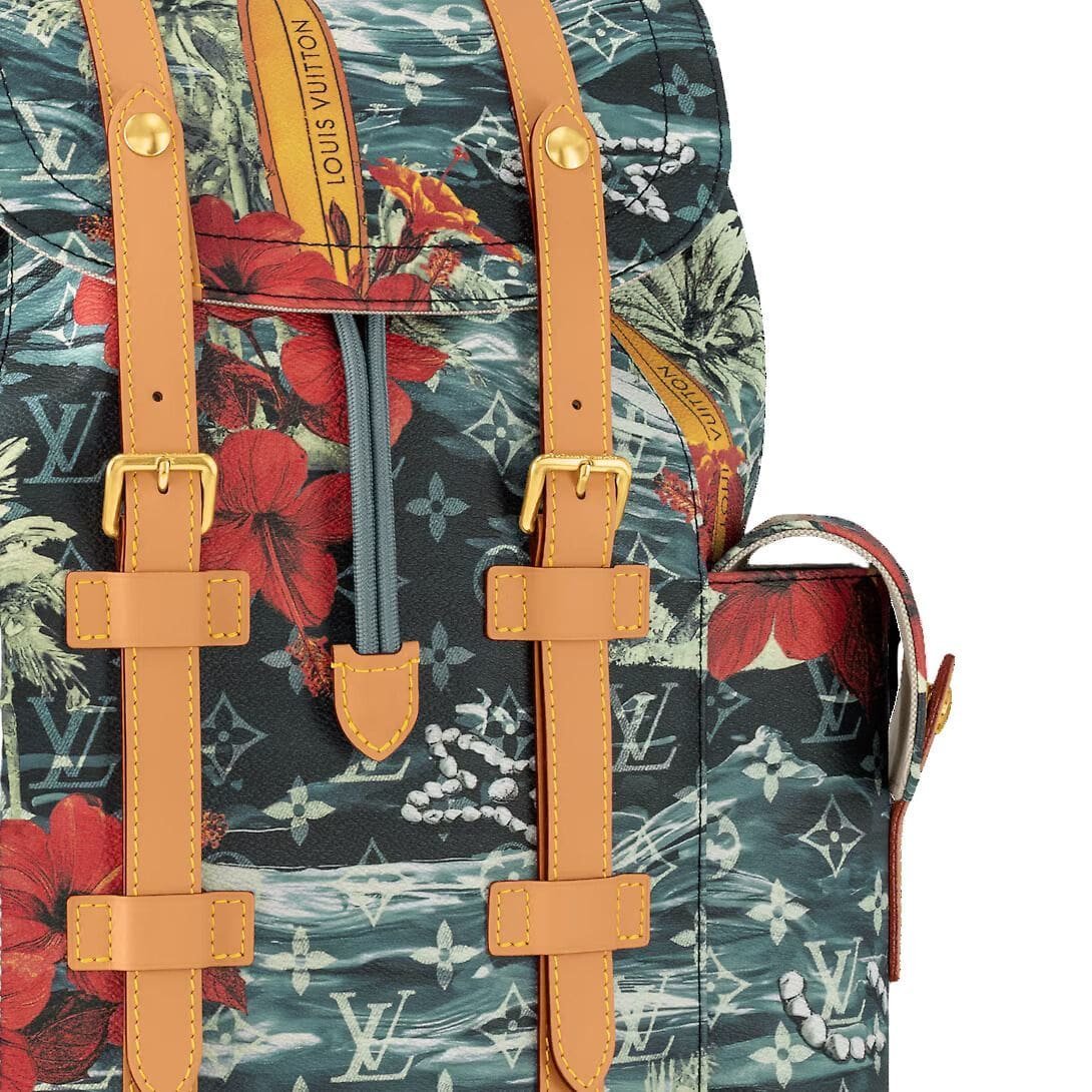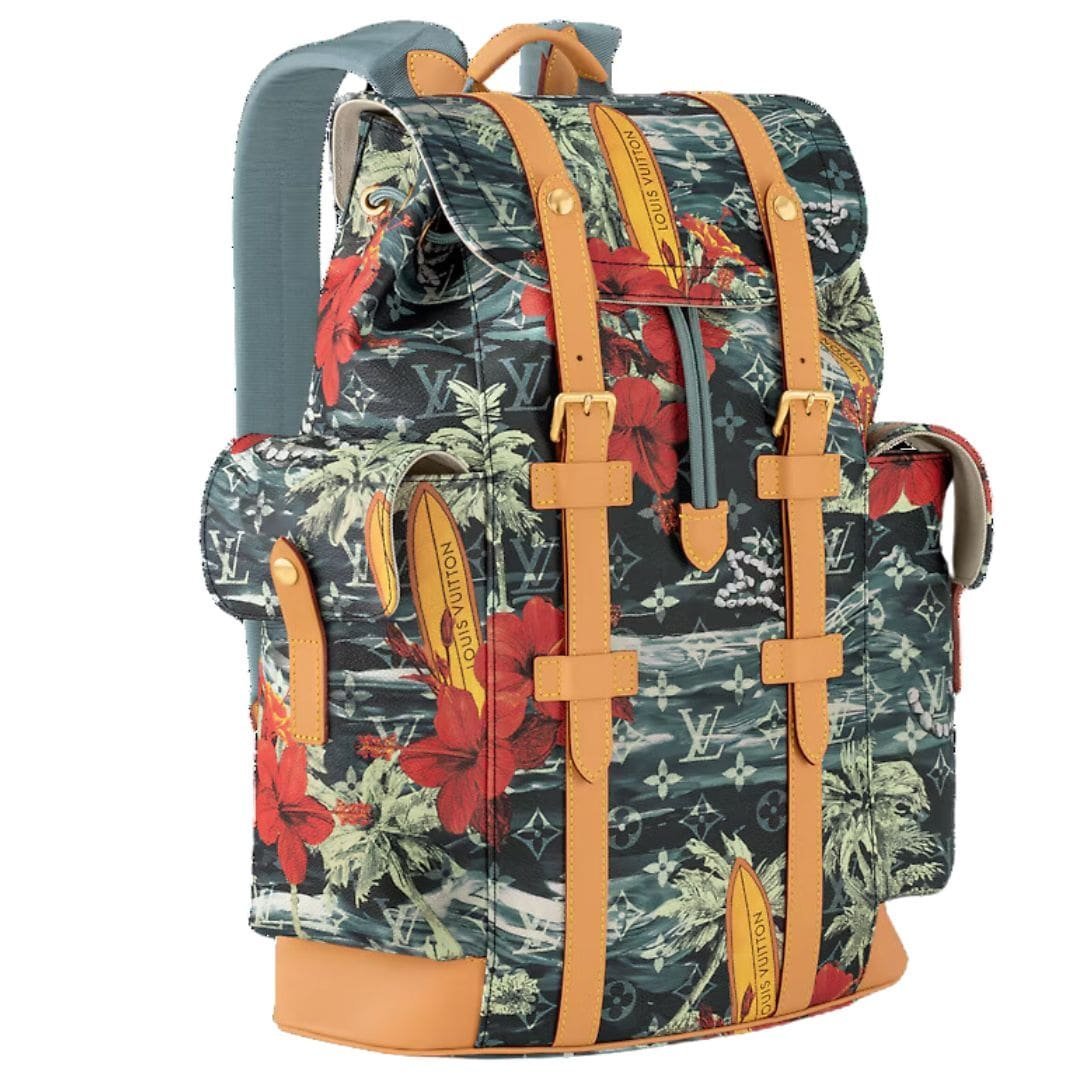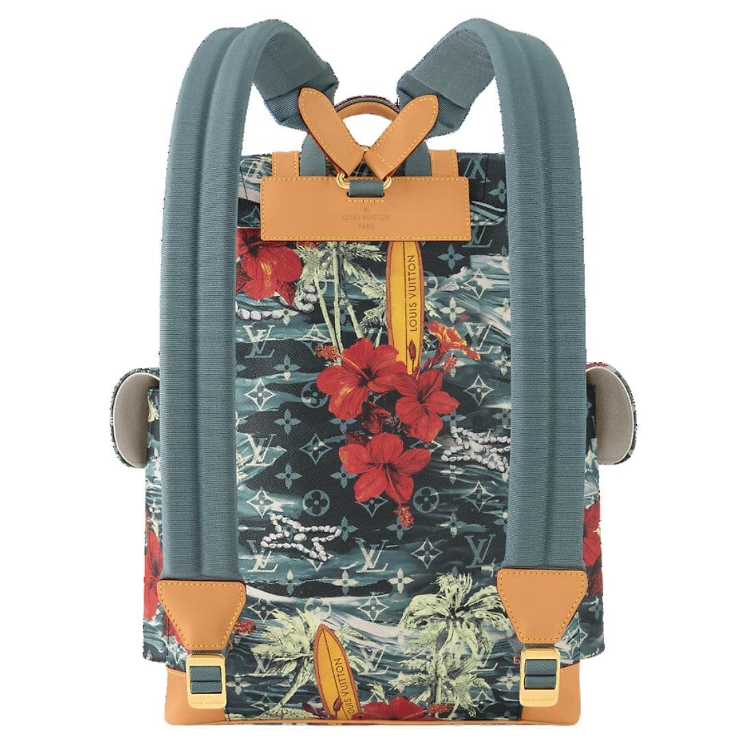 Introducing the LOUIS VUITTON CHRISTOPHER MM a modern twist on the classic rucksack, styled with Pharrell Williams’ Monogram Surfin’ canvas. This unique print features layers of elaborate motifs, including surfboards and flowers, creating a colorful vintage feel that stands out. The navy blue coated canvas is complemented by polished gold-color hardware and cowhide-leather trim, making it both stylish and durable.