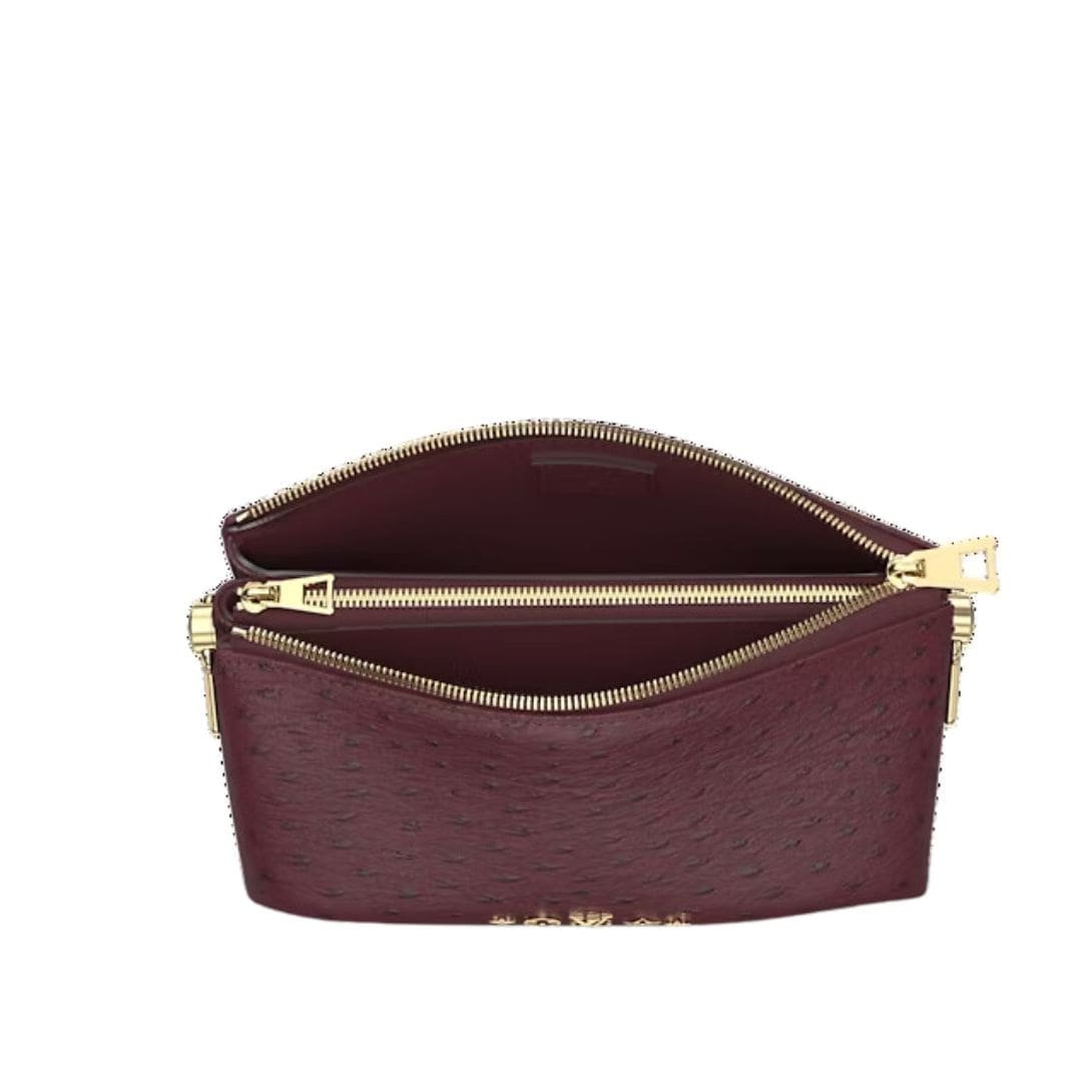 The Bordeaux hue of the ostrich leather, complemented by ostrich leather trim, evokes the richness and fullness of great Bordeaux vintages, adding a touch of sophistication to every ensemble. The goatskin lining ensures a luxurious feel, while the gold color hardware adds a hint of opulence.