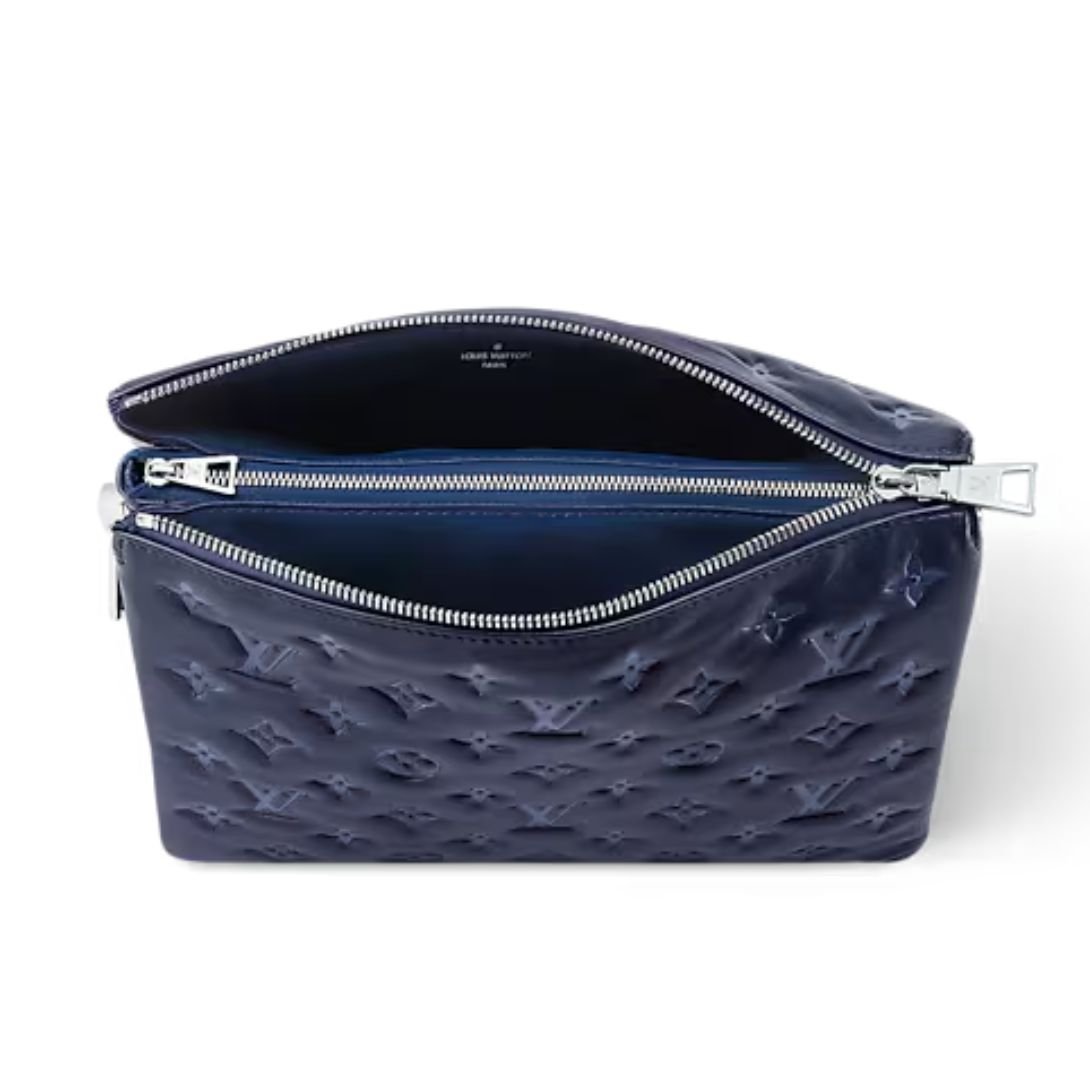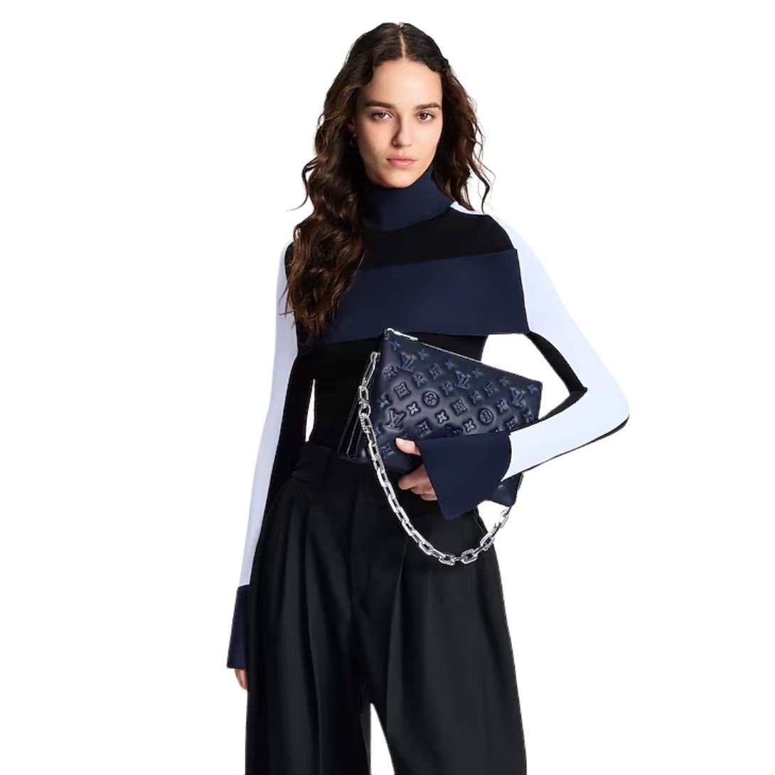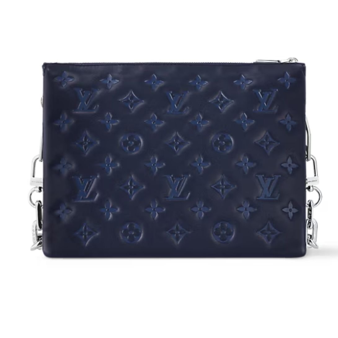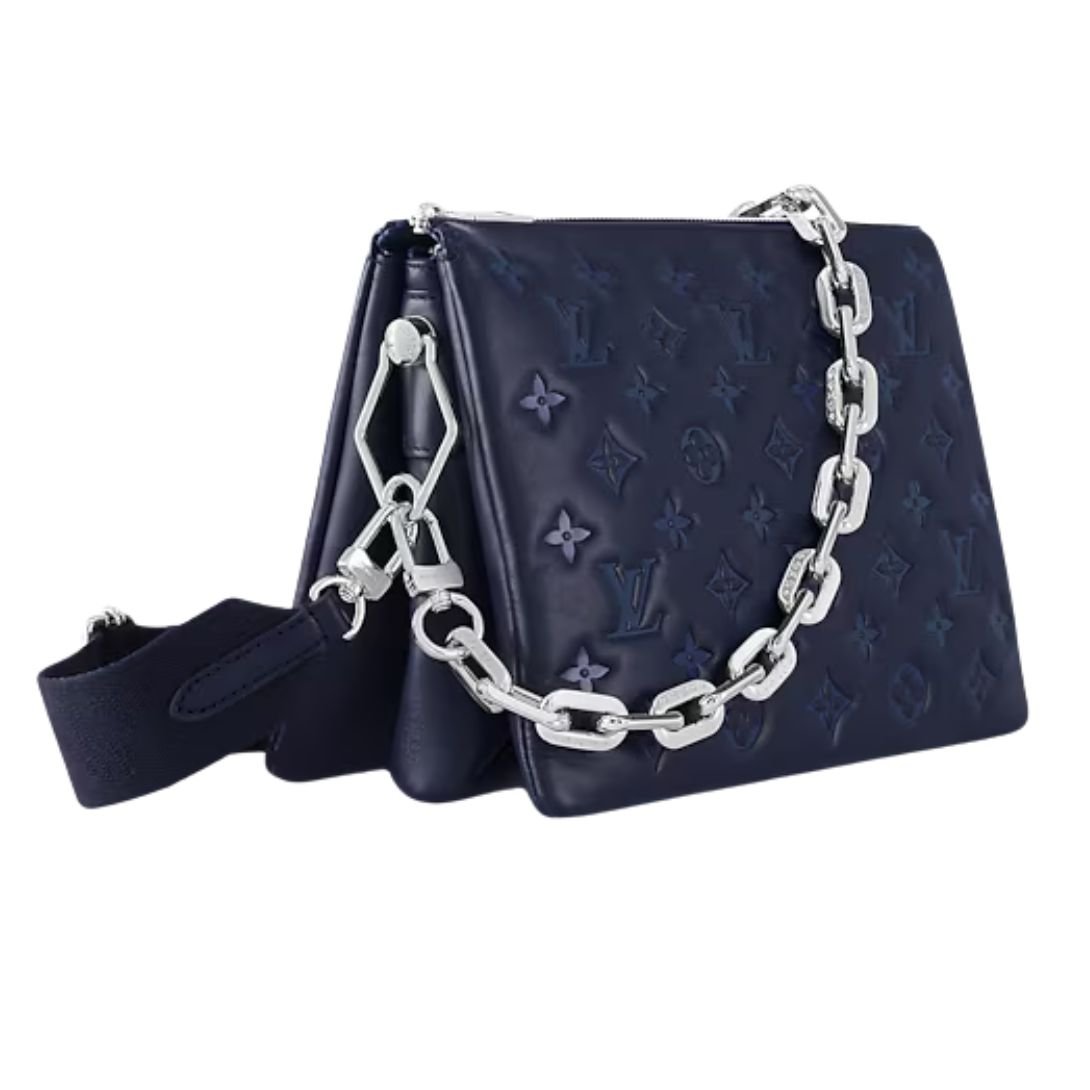 The Coussin PM in Marine Blue is a bold expression of modern femininity. Designed by Nicolas Ghesquière for the Fall-Winter 2020-21 Collection, this eye-catching handbag combines puffy Monogram-embossed lambskin with a chunky silver-color chain. Its vibrant hue and plush structure make it a standout piece, while maintaining the versatility to pair with both casual and elevated looks.