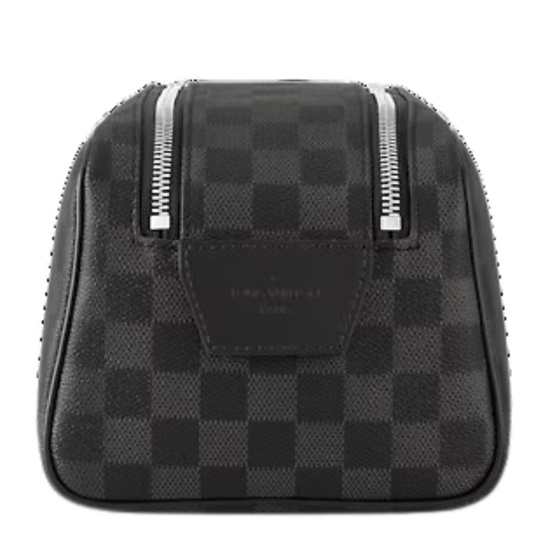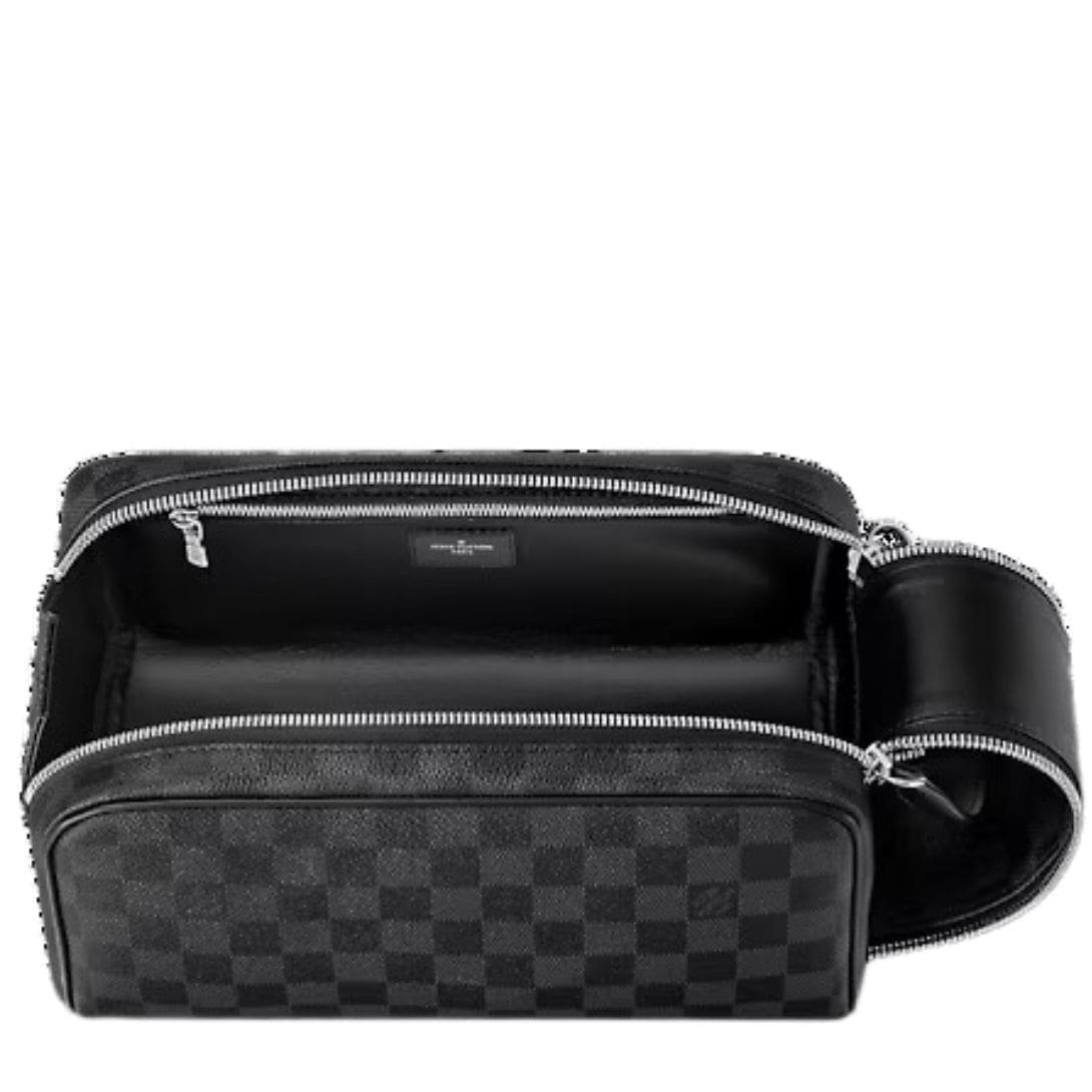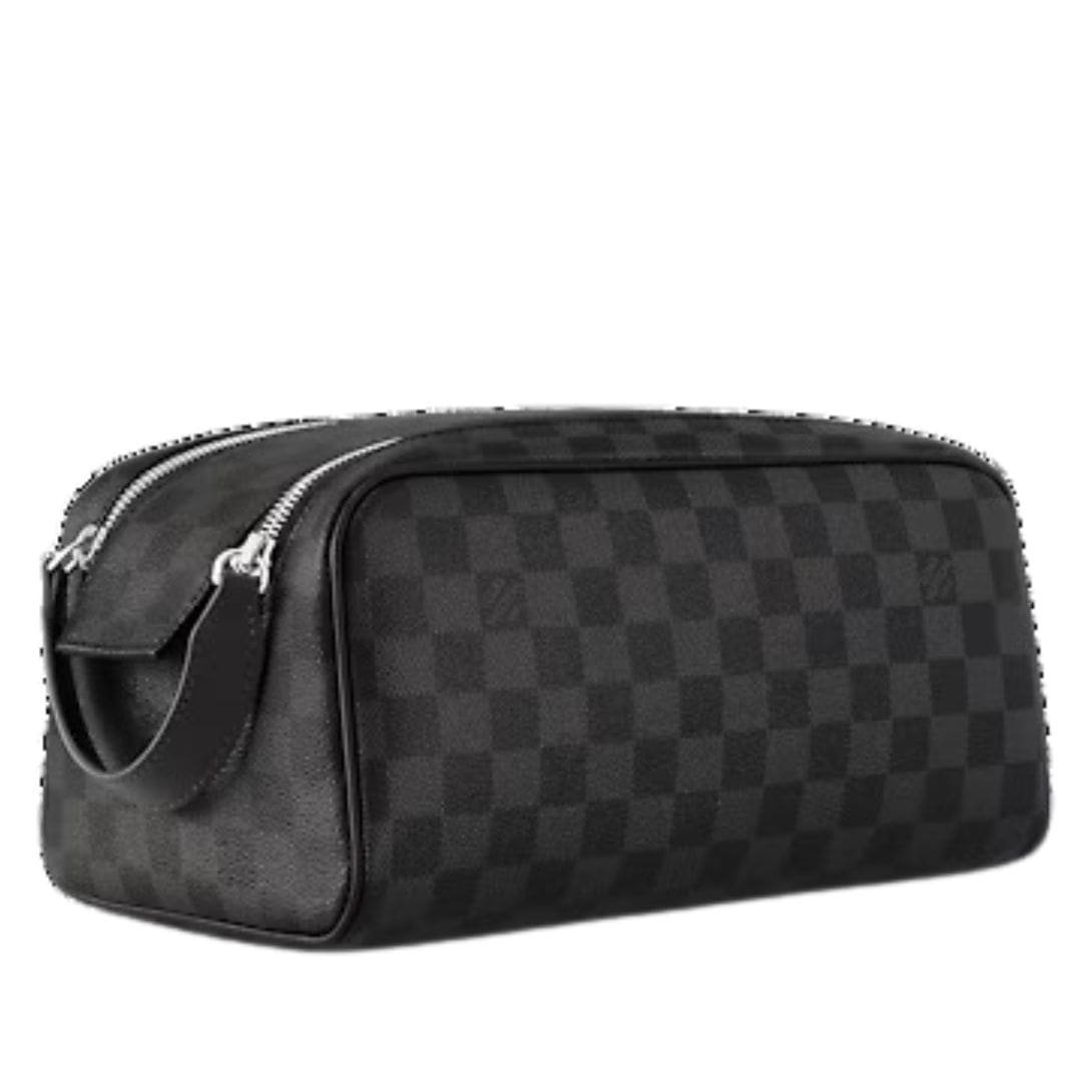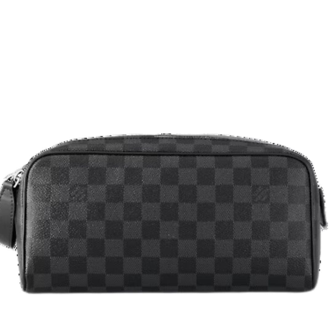 The Damier Graphite LOUIS VUITTON DOPP KIT TOILET POUCH is the epitome of Louis Vuitton’s dedication to craftsmanship, style, and sustainability, making it an essential accessory for the modern traveler.