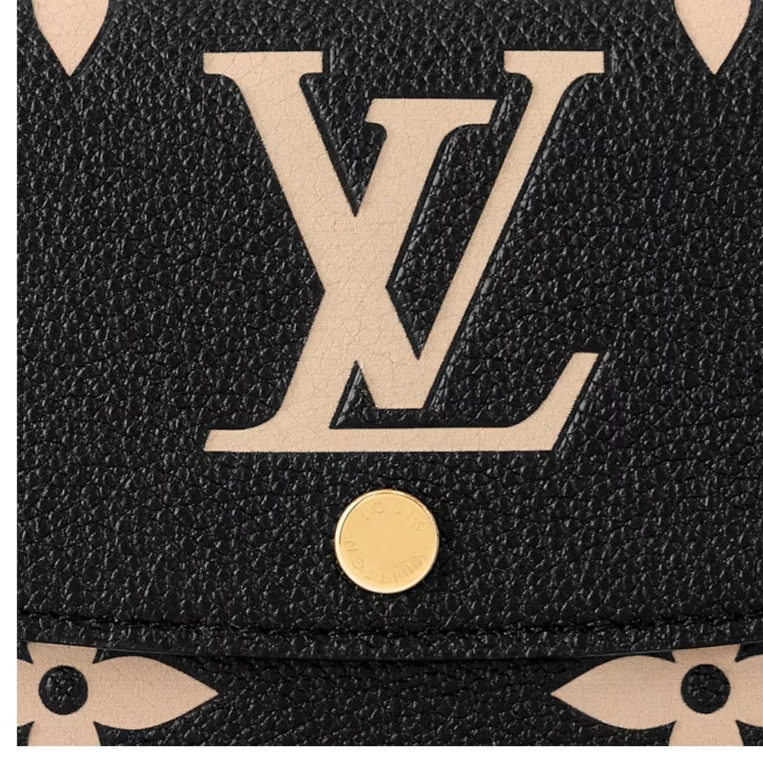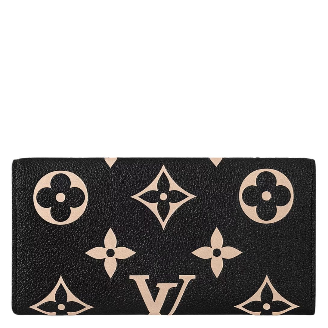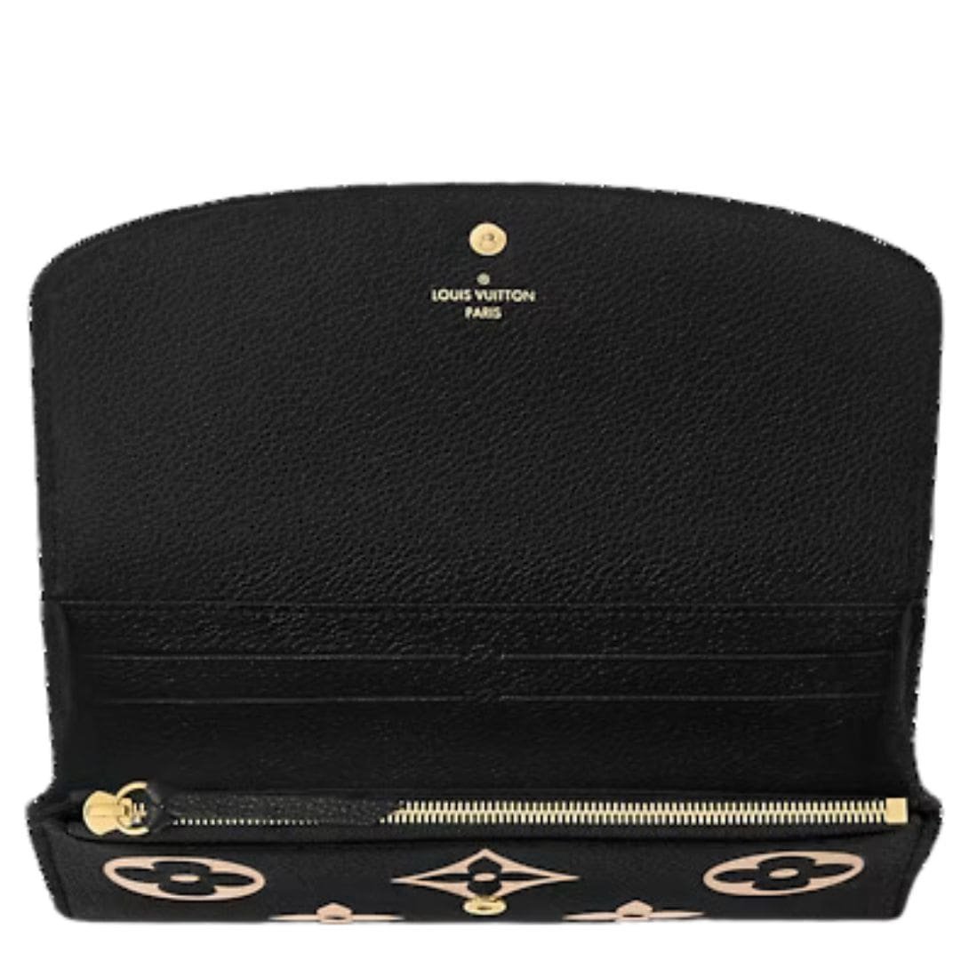 The LOUIS VUITTON EMILIE WALLET in grained Monogram Empreinte leather combines slim elegance with versatile functionality, serving as both a wallet and a clutch. This eye-catching accessory showcases an oversized Monogram pattern embossed and printed in a striking beige on black leather, making it a standout piece in any collection.