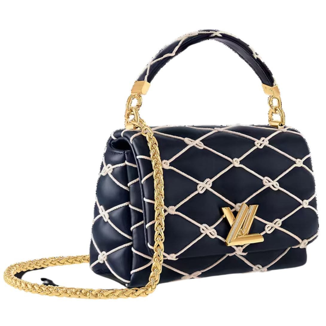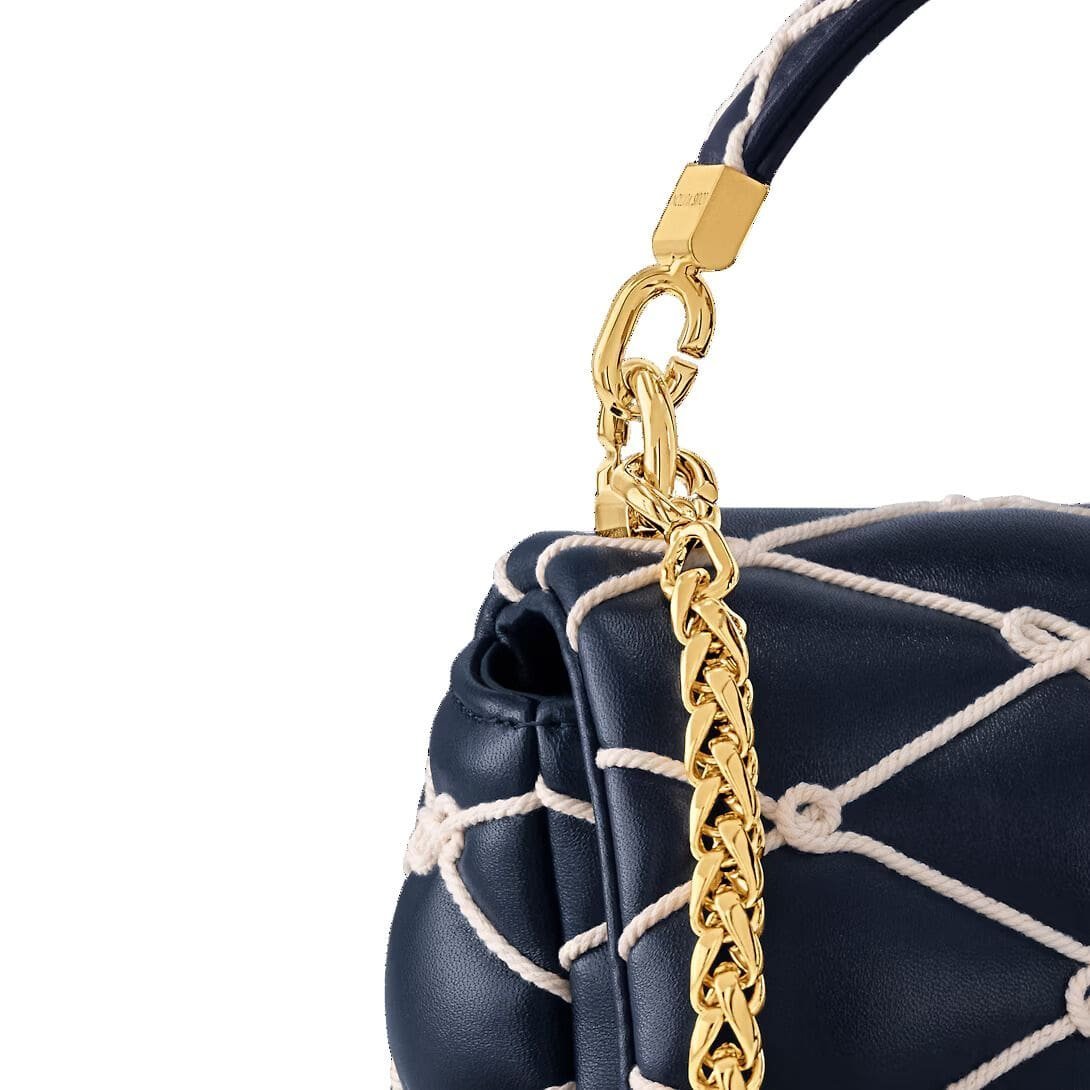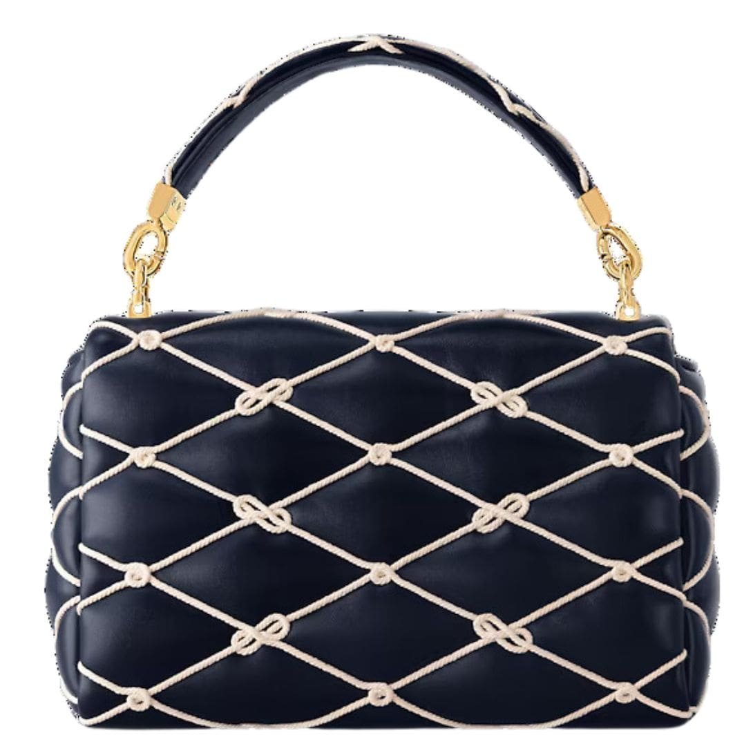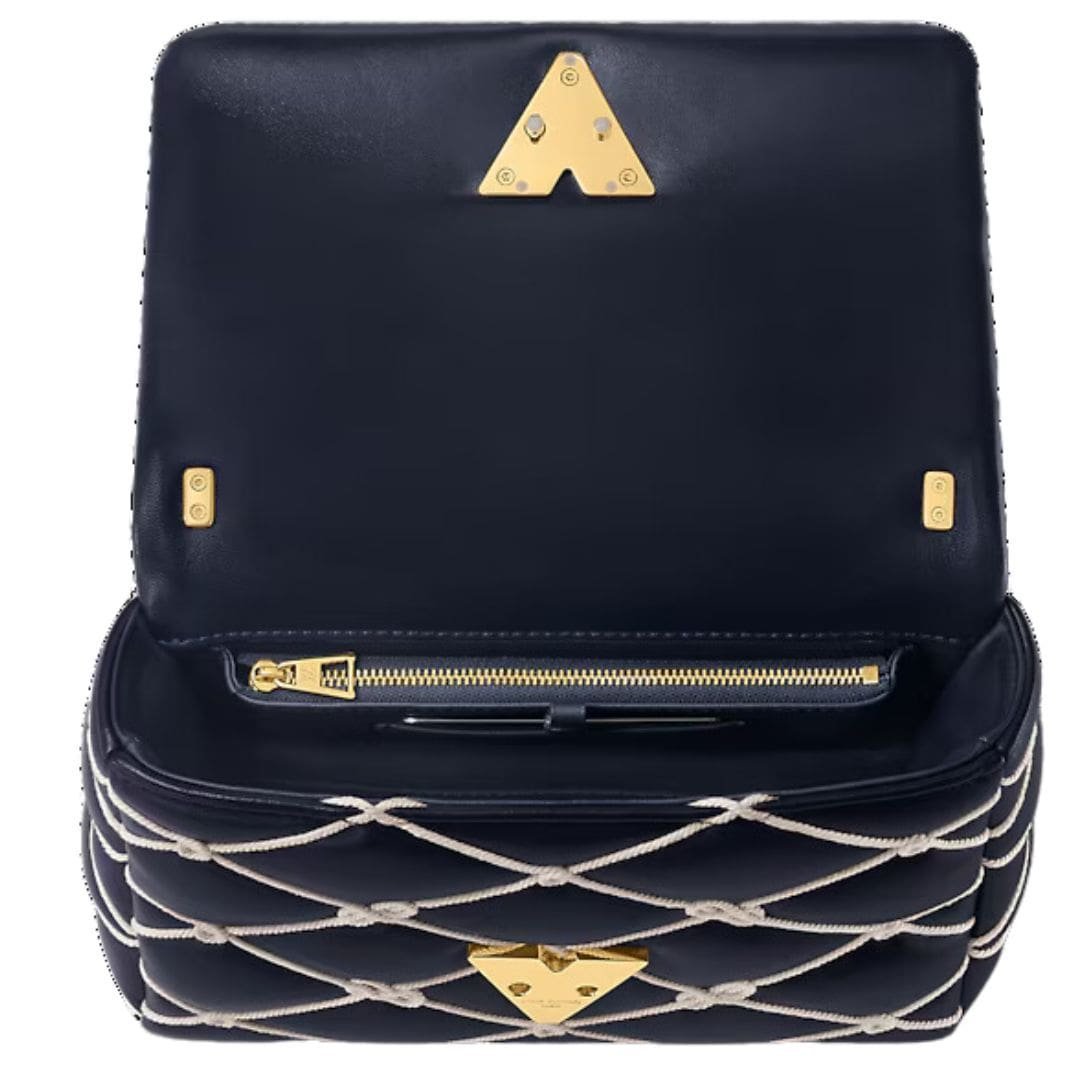 Part of Louis Vuitton’s exquisite Nautical Collection, the LOUIS VUITTON GO-14 MM handbag combines elegance with maritime inspiration. Crafted from padded lambskin in a sophisticated navy blue, this bag is adorned with an intricate embroidered cotton rope motif, inspired by sailors’ knots. The combination of luxurious materials and thoughtful design makes this piece a standout accessory.