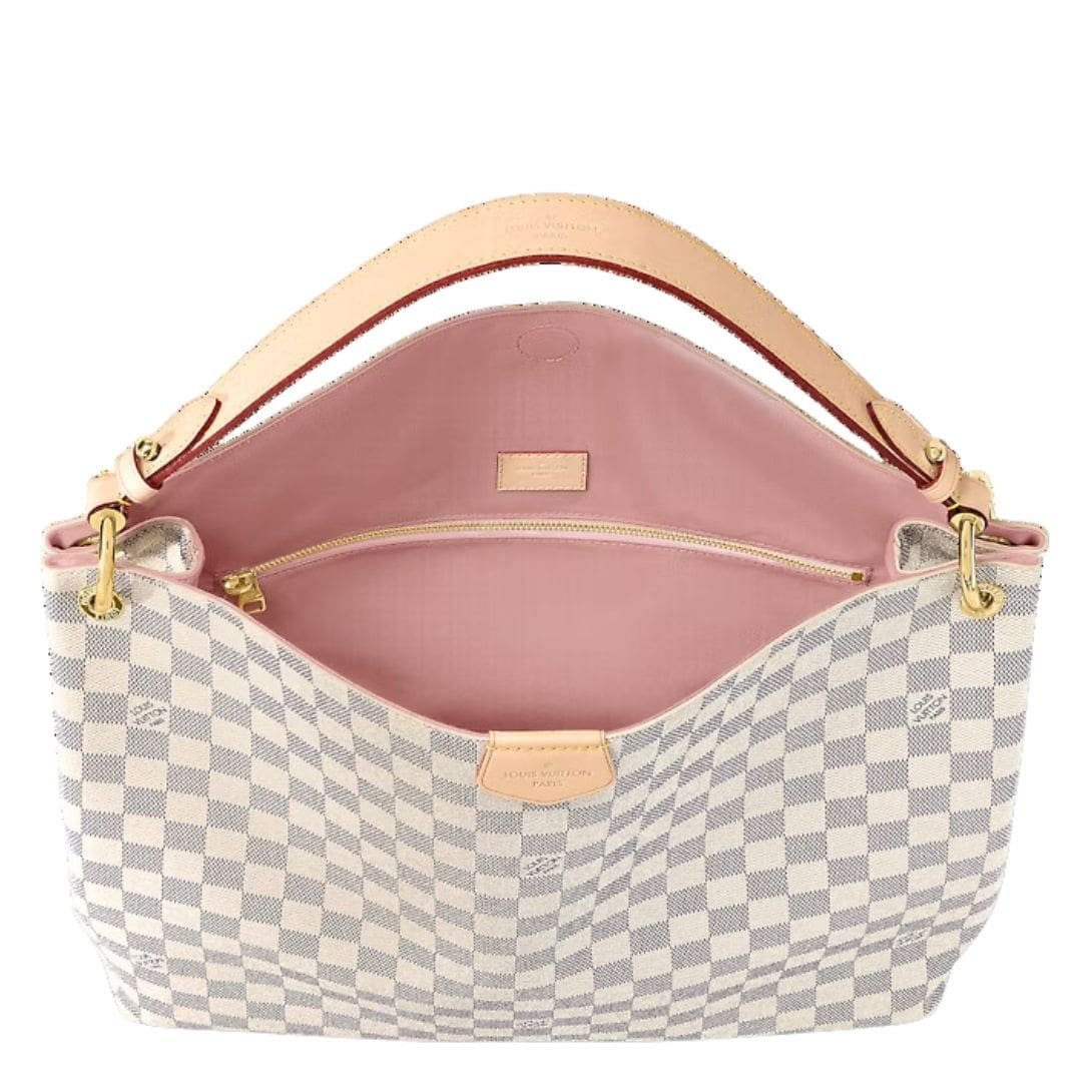 Measuring 16.1 x 13.8 x 5.5 inches (length x height x width), the LOUIS VUITTON GRACEFUL MM offers ample room for all your essentials while maintaining a sleek and elegant silhouette. Natural cowhide leather detailing and shiny golden hardware add a refined, signature touch to the iconic Monogram canvas.