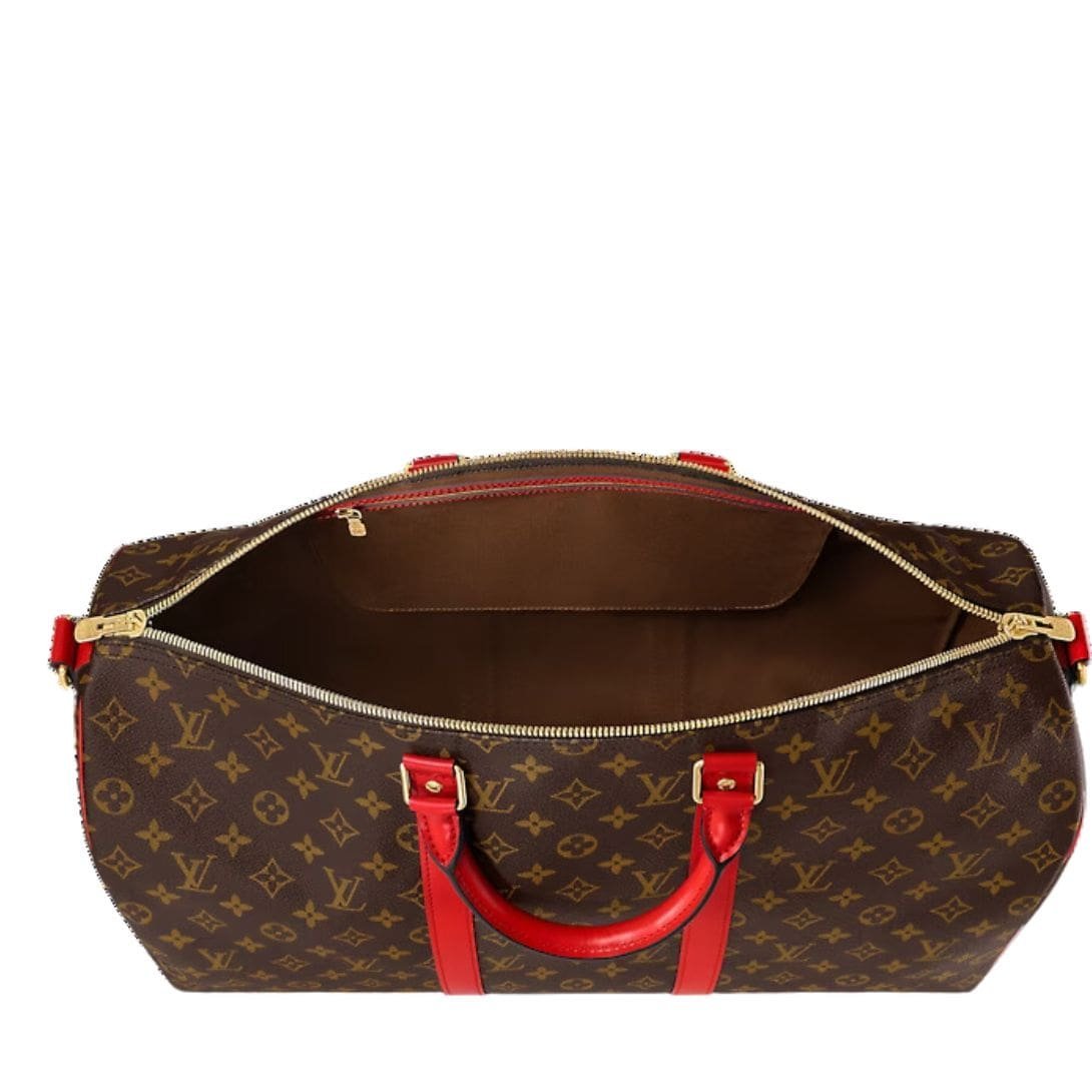 Introducing the epitome of contemporary travel: the Summer edition Keepall, where timeless elegance meets functionality. Crafted with precision and finesse, this iconic piece blends classic Monogram Canvas with vibrant Coquelicot cowhide leather trimmings, exuding sophistication at every seam.