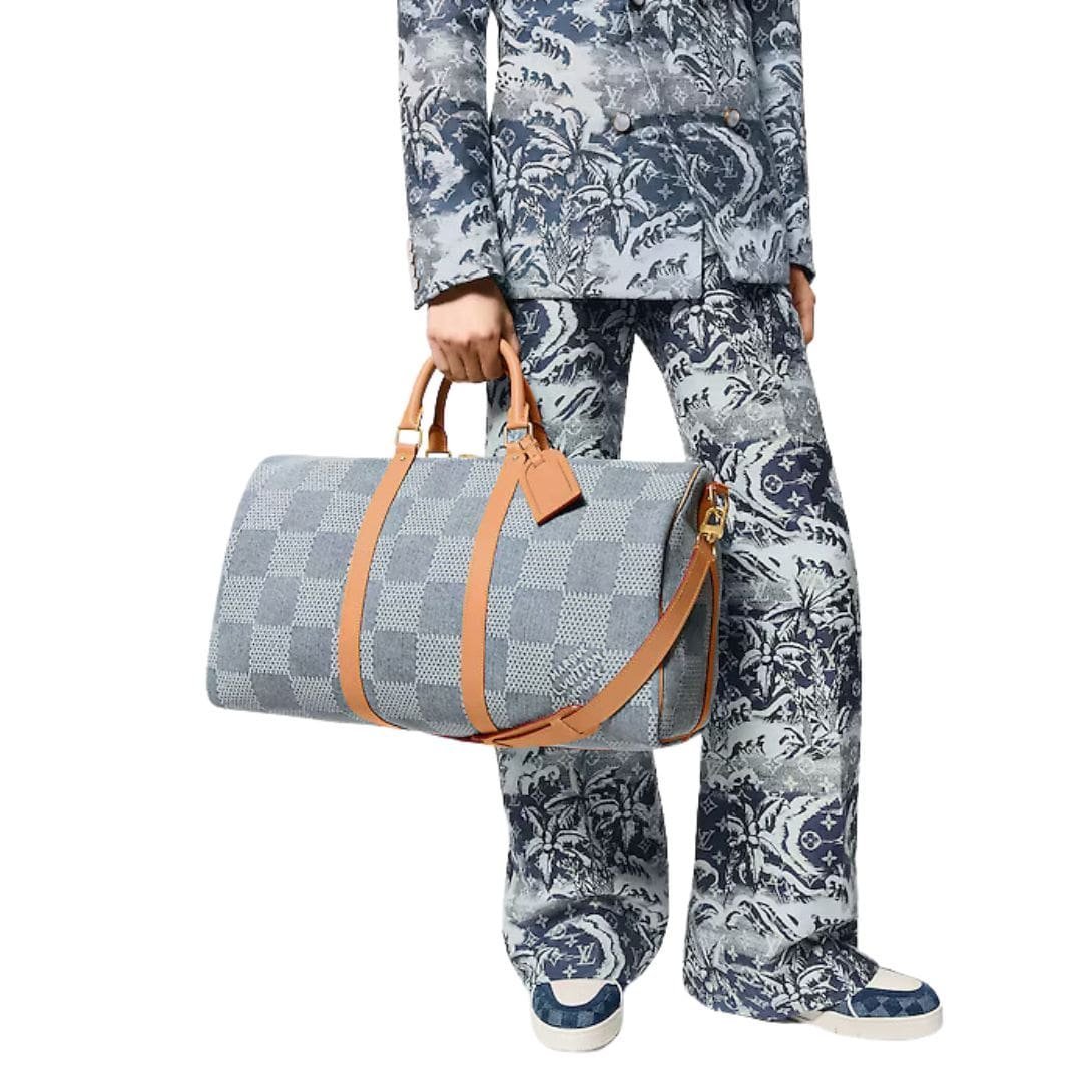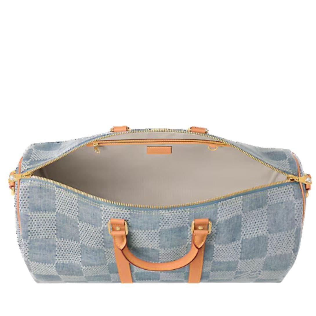 Introducing the LOUIS VUITTON KEEPALL BANDOULIERE 50 now available in the exquisite Damier Denim 3D cotton canvas. This innovative take on Louis Vuitton’s classic Damier pattern showcases a summery aesthetic, perfect for the modern traveler. Crafted from organic cotton, the canvas undergoes a meticulous process where it is cut, bleached, dyed, and washed to achieve a unique, washed-out look with a subtle 3D texture. This attention to detail gives the bag a distinctive, textured appearance that stands out.
