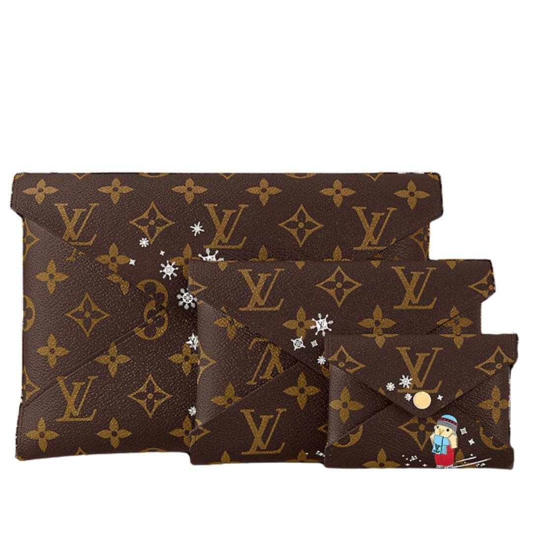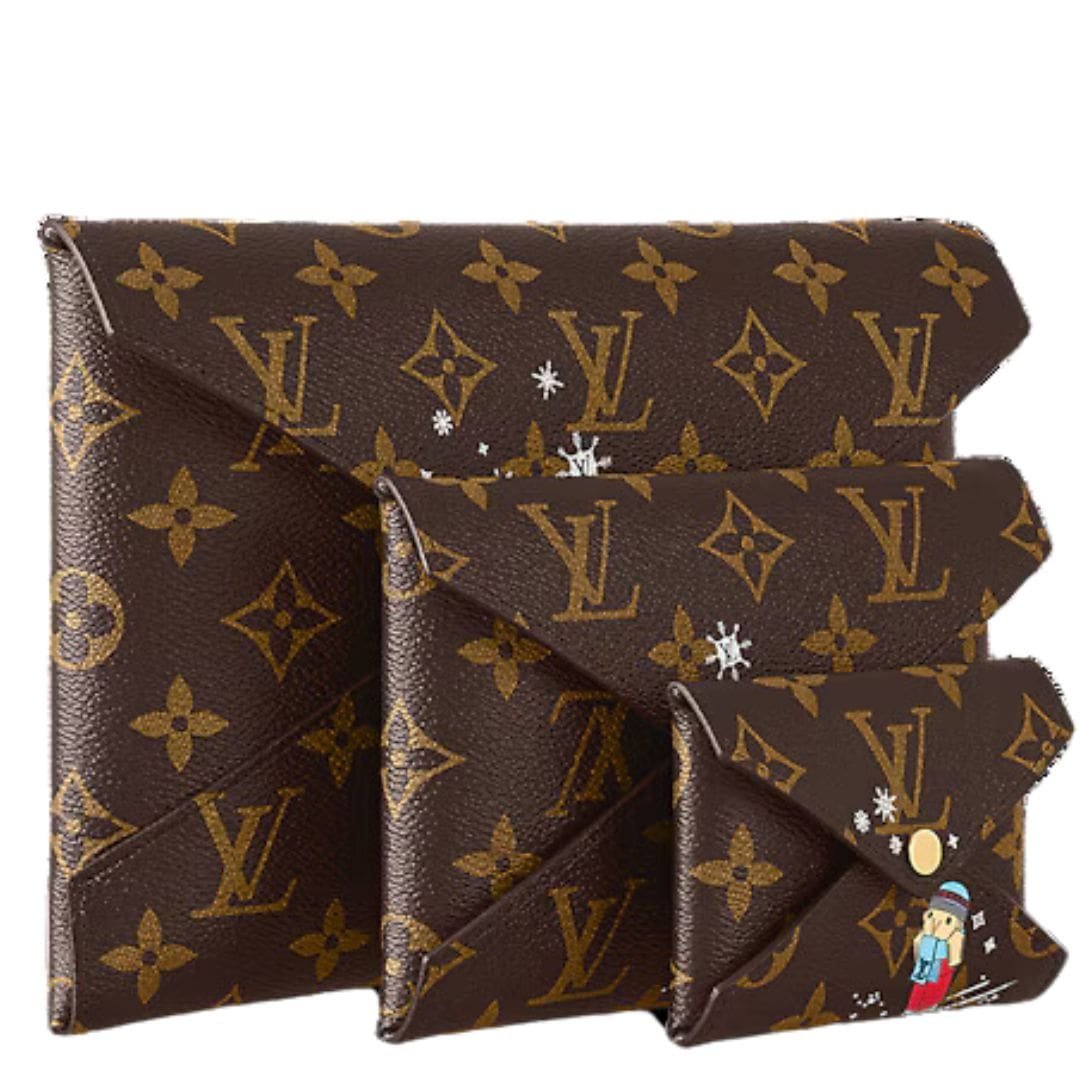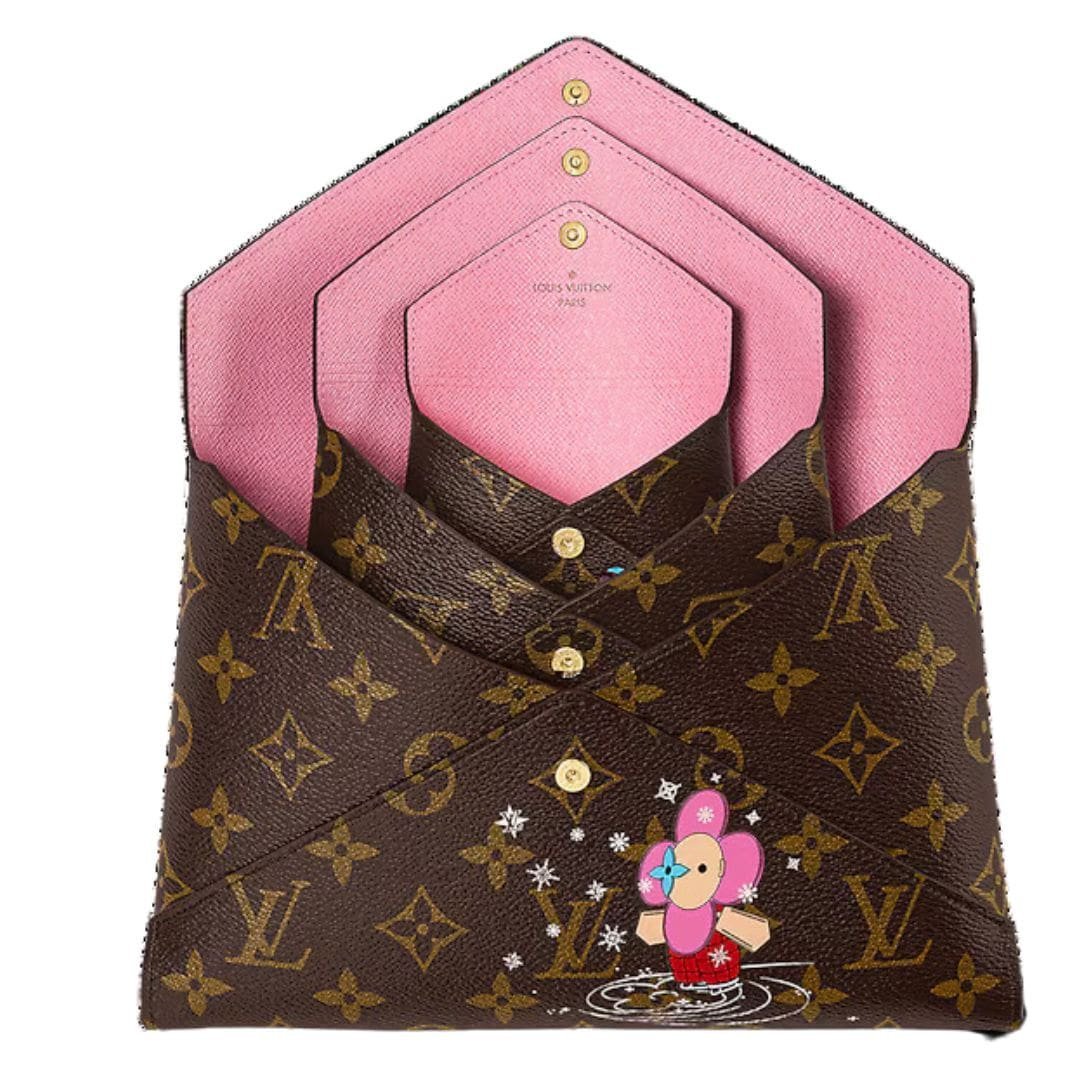 The LOUIS VUITTON KIRIGAMI POCHETTE by Louis Vuitton is a delightful and versatile accessory crafted from Monogram coated canvas and lined with vibrant pink leather. This collectible edition features three envelopes that nest within one another like Russian dolls, each adorned with charming prints of the House mascot Vivienne and her friends engaging in winter activities like skating and sledding.