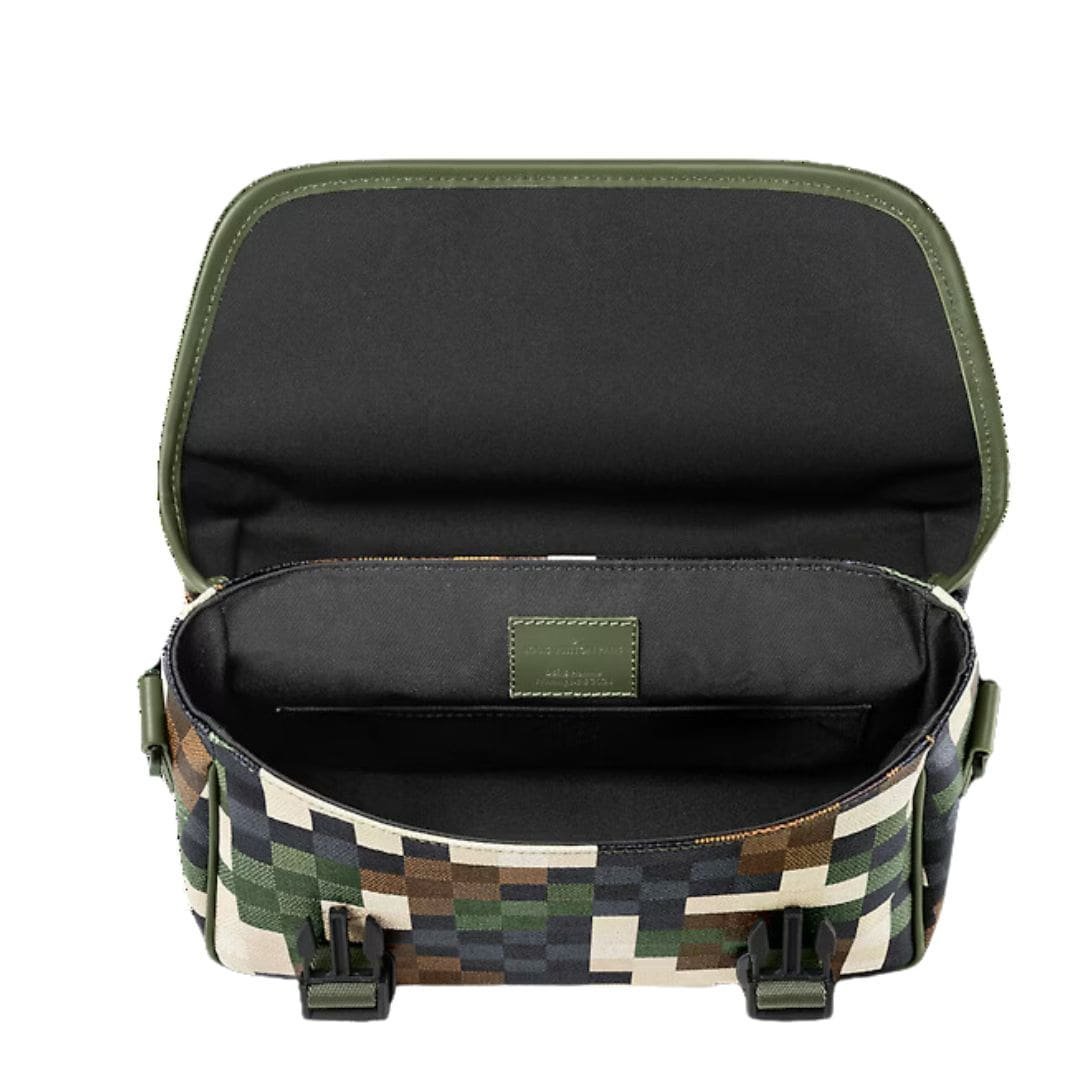 Introducing the LOUIS VUITTON LV TRAIL MESSENGER, a bold fusion of urban sophistication and natural allure envisioned by Creative Director Pharrell Williams. This distinctive messenger bag showcases Williams’ innovative pixelated Damoflage coated canvas, a captivating blend of the House’s classic Damier motif with camouflage, symbolizing the harmonious coexistence of polished urban landscapes and the untamed beauty of nature.