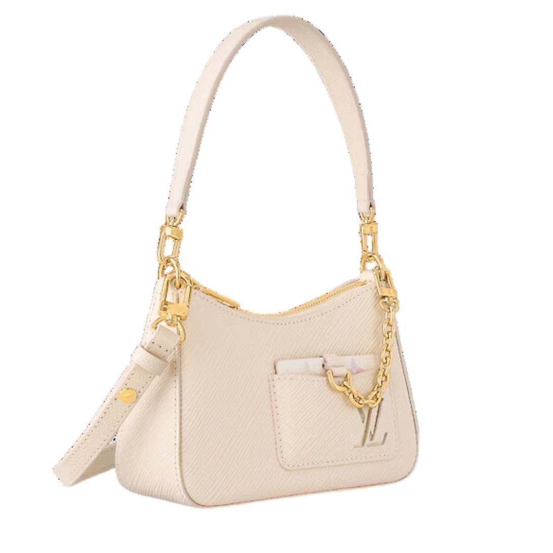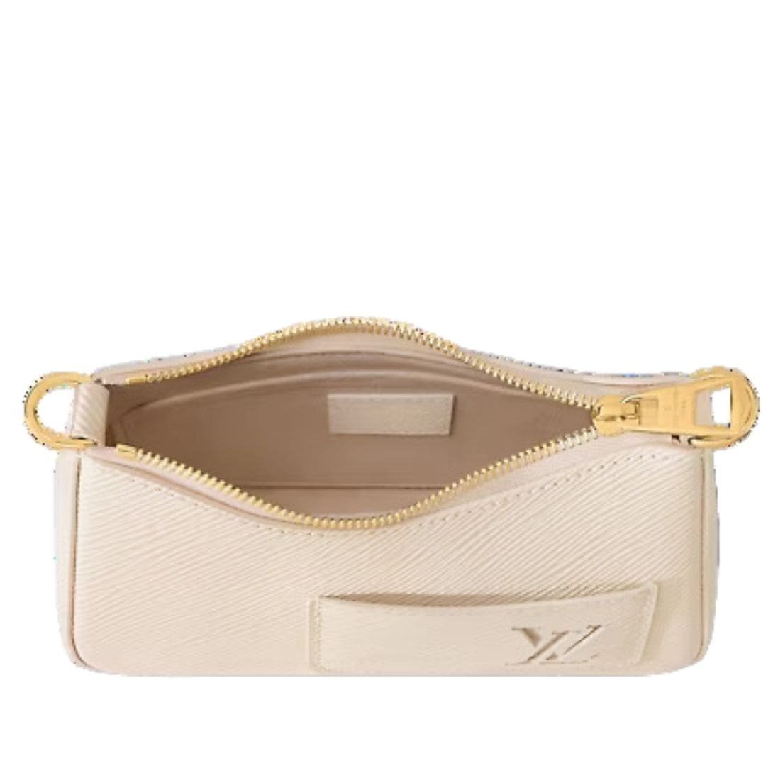 Measuring 7.5 x 5.3 x 2.6 inches, the LOUIS VUITTON MARELLINI is compact yet practical, ideal for both day and evening affairs. Its versatility is enhanced by a removable and adjustable strap, offering multiple styling options with a drop ranging from 11.8 to 14.8 inches.