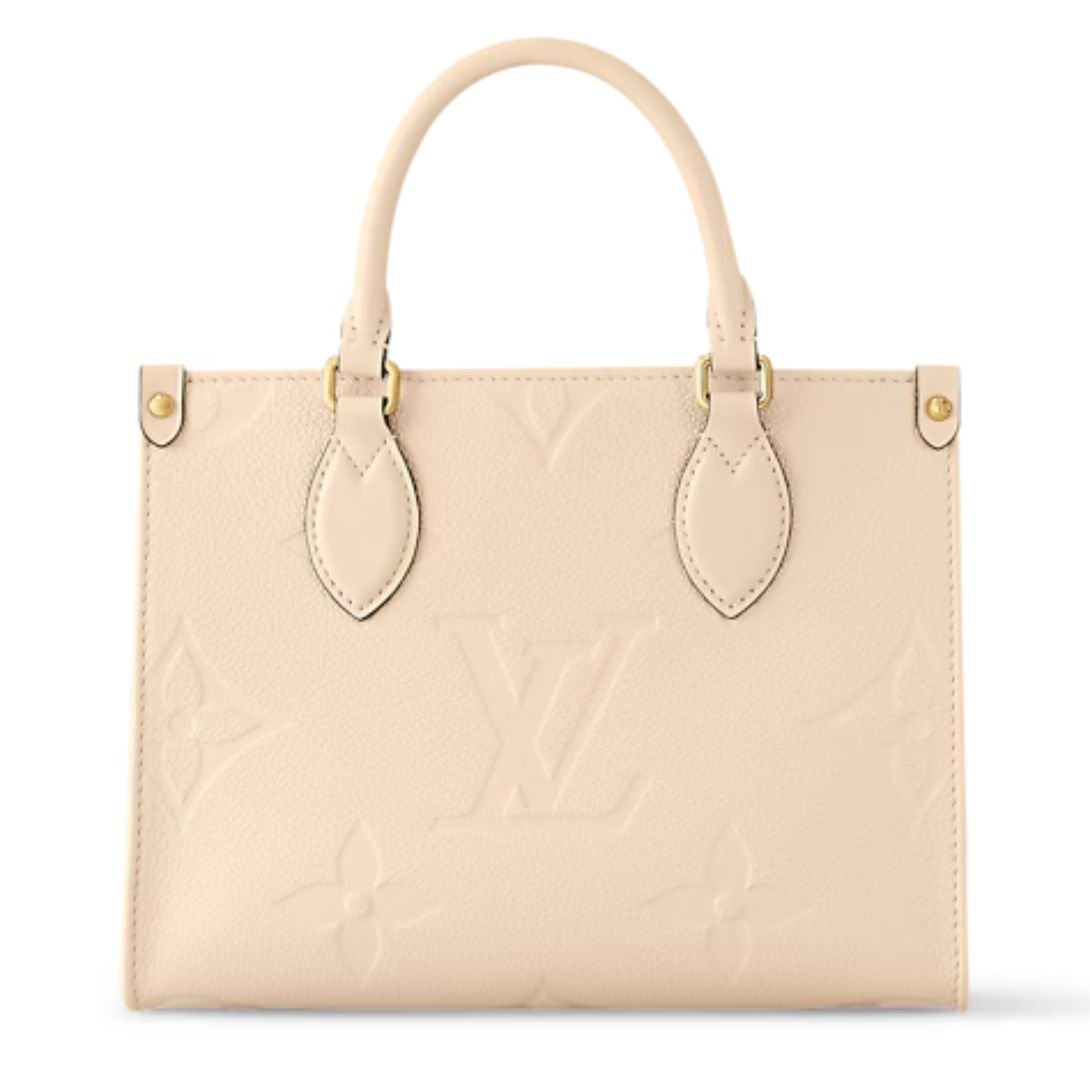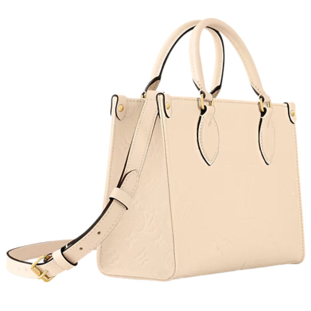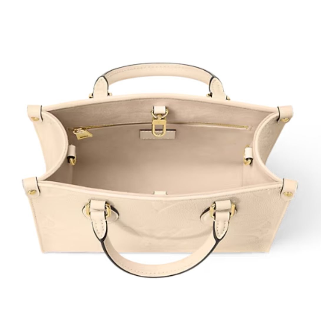Delicate yet distinctive, the OnTheGo PM in Crème Beige showcases the luminous quality of Monogram Empreinte leather. With LVs and Monogram Flowers subtly embossed into the grained cowhide, this petite tote balances timeless Louis Vuitton style with everyday functionality.