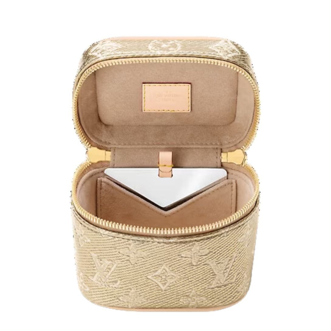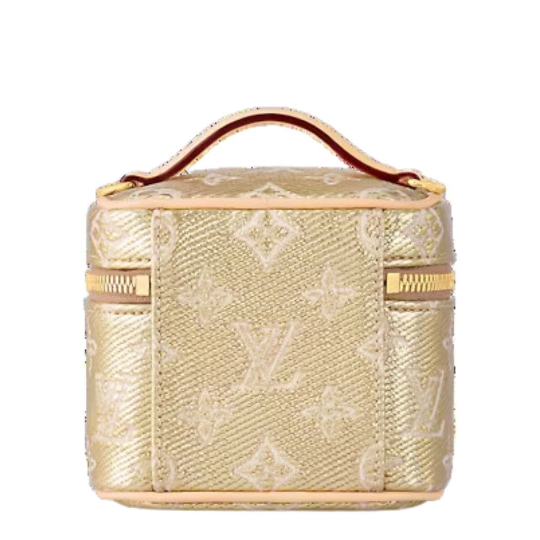 Introducing the LOUIS VUITTON MICRO VANITY, a chic and compact accessory that embodies contemporary style. Crafted from Monogram canvas, this miniature bag boasts a jacquard canvas with a special coating, creating striking metallic effects that elevate any ensemble. Its petite size, measuring 4.3 x 3.9 x 3.1 inches, makes it perfect for carrying small essentials in style.