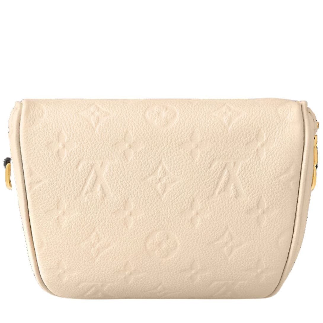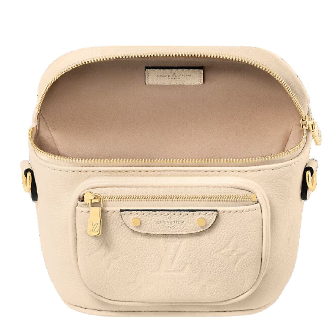 Measuring 6.7 x 4.7 x 3.7 inches, the LOUIS VUITTON MINI BUMBAG is both compact and practical, perfect for carrying your essentials. Its elegant cream-colored Monogram Empreinte embossed cowhide leather is complemented by cowhide leather trim and a luxurious microfiber lining. The bag is adorned with gold-color hardware, adding a touch of sophistication and timeless appeal.