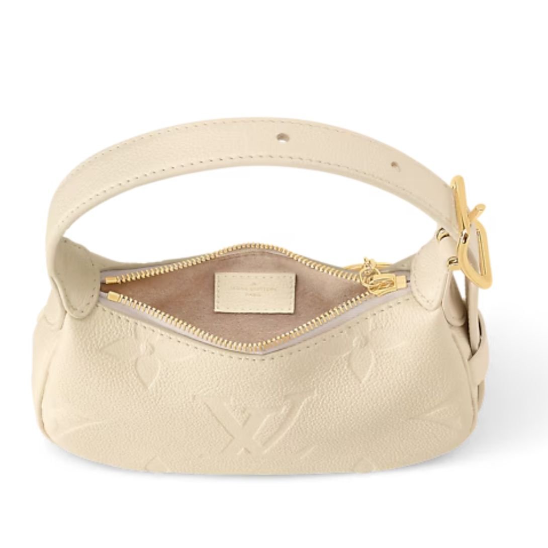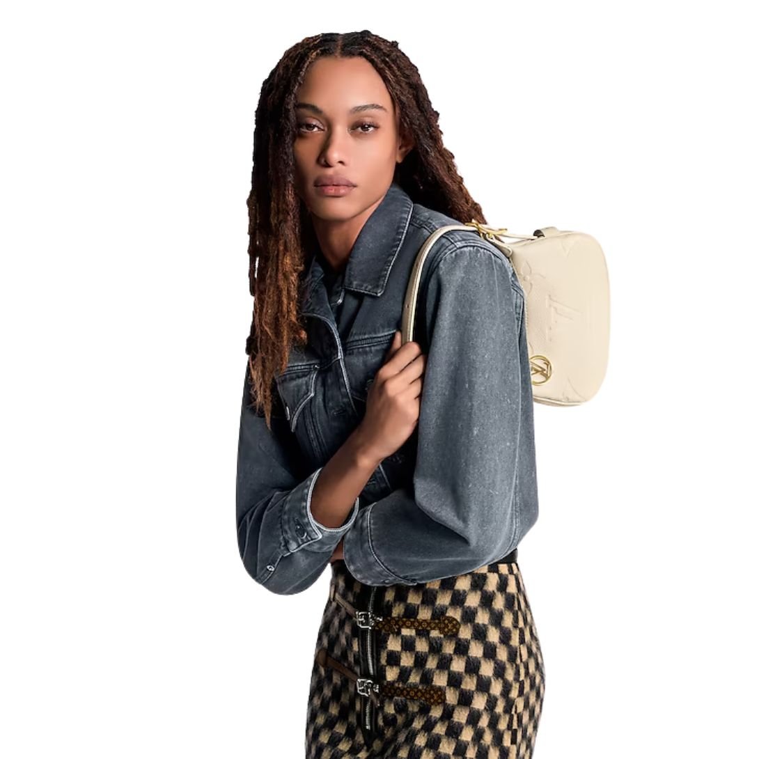 Crafted from supple, grained cowhide leather, the bag features Louis Vuitton’s embossed Monogram pattern, adding depth and texture. The creamy tone is both soft and sophisticated, while gold-color hardware and an oversized LV Circle zip pull add a jewel-like touch of glamour.