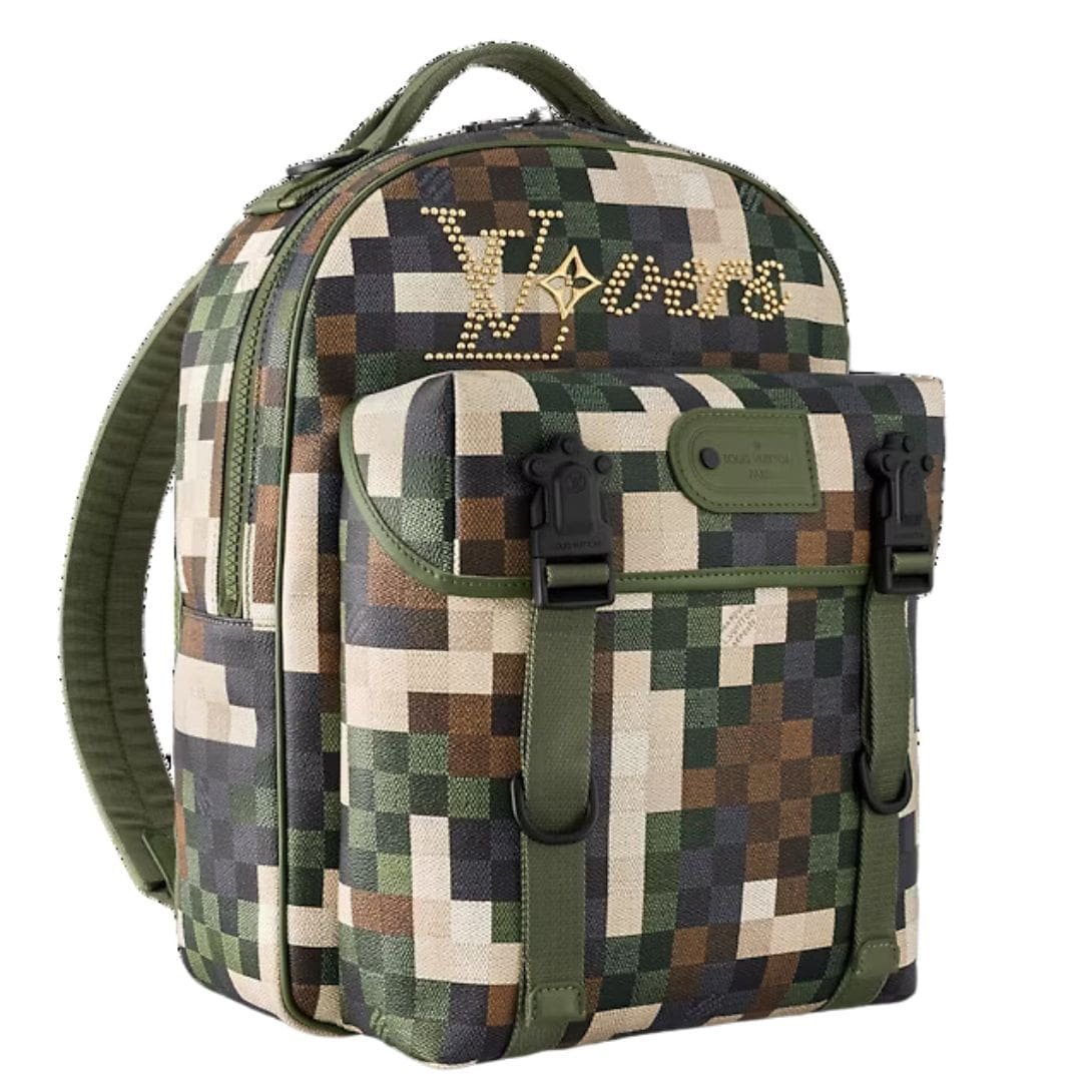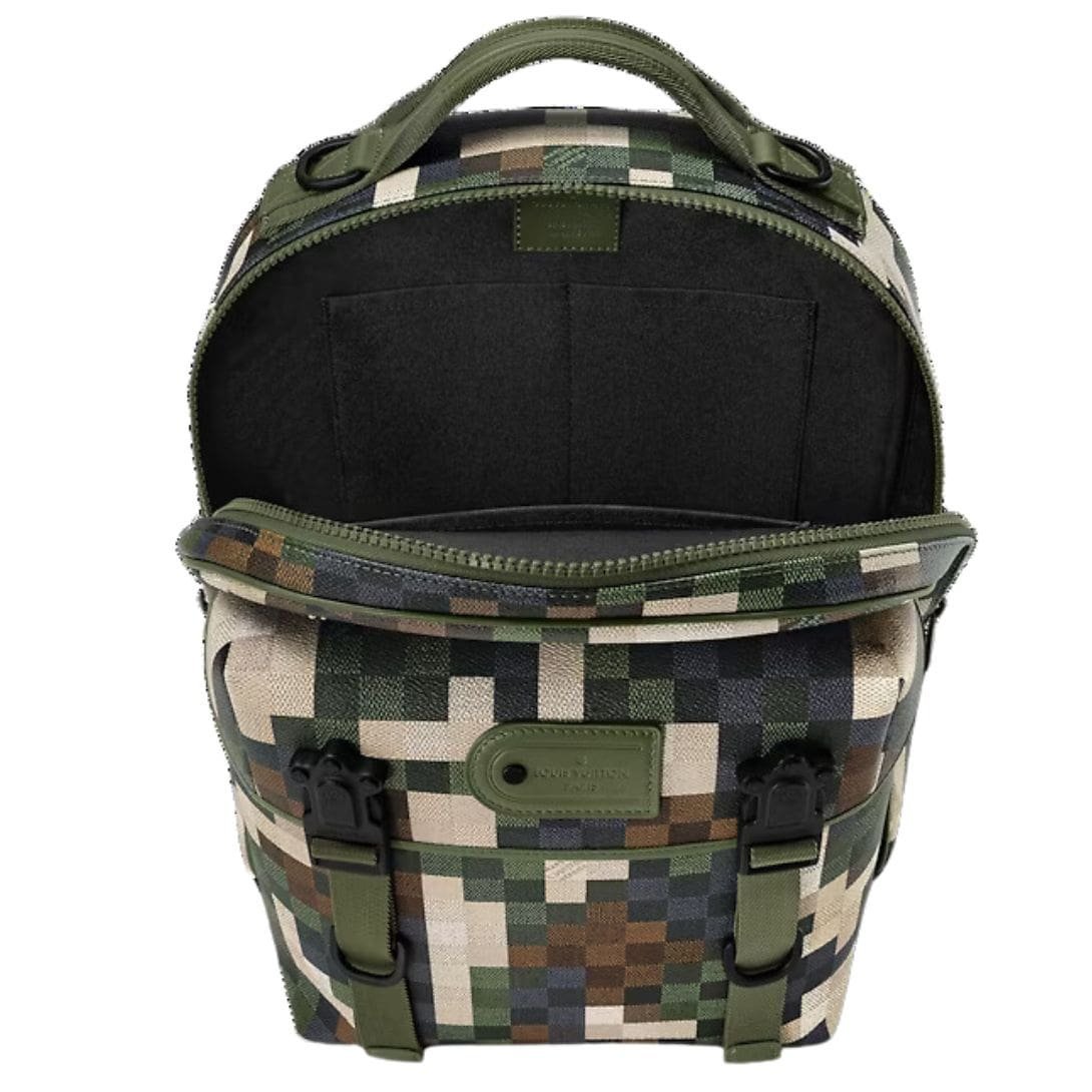 Introducing the LOUIS VUITTON MOTION BACKPACK , a bold fusion of functionality and fashion crafted from Damoflage-coated canvas, Pharrell Williams’ innovative reinterpretation of the iconic Damier motif. Designed to make a statement, this backpack showcases Williams’ unique vision with a pixilated camouflage pattern, while retaining the timeless elegance synonymous with Louis Vuitton.