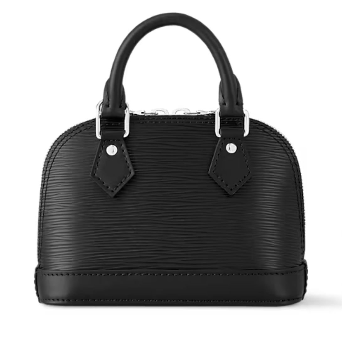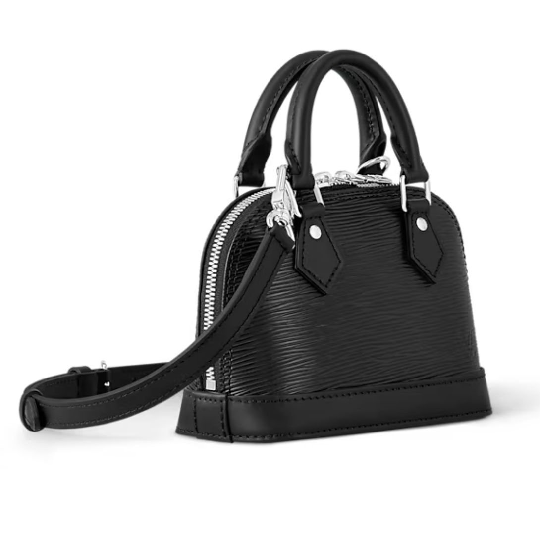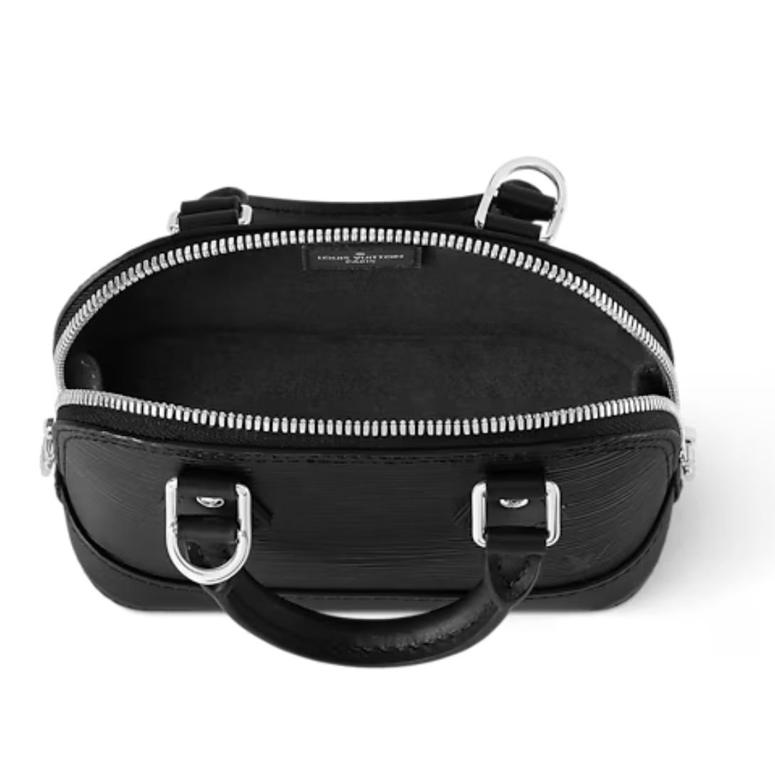 Made from black Epi grained cowhide leather, the Nano Alma is designed for both durability and elegance. The interior is lined with microfiber, providing a soft, protective finish for your belongings. Silver-tone hardware adds a touch of modern sophistication, while the signature double zip closure ensures secure storage.