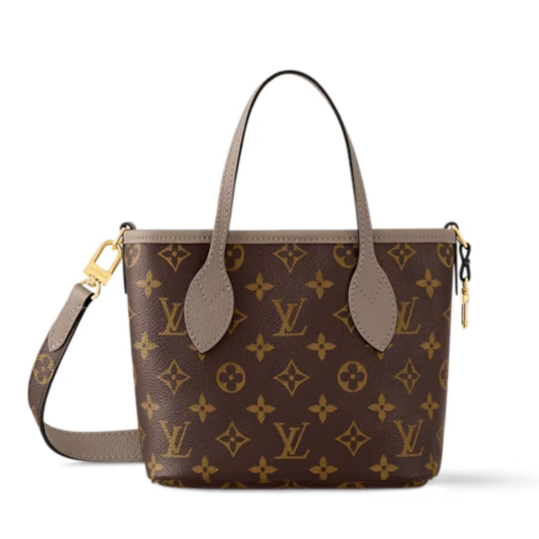 This season’s Neverfull Bandoulière Inside Out BB redefines versatility with a chic, reversible design. Crafted in signature Monogram coated canvas and rich Dark Fango grained cowhide leather, it offers two elegant looks in one refined silhouette. With gold-toned hardware and sleek leather trim, this piece merges timeless Louis Vuitton heritage with modern styling.