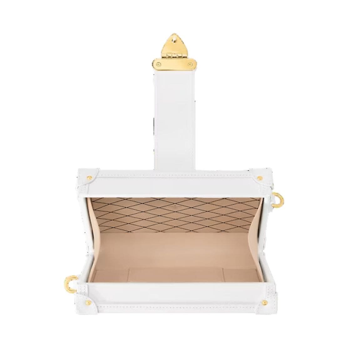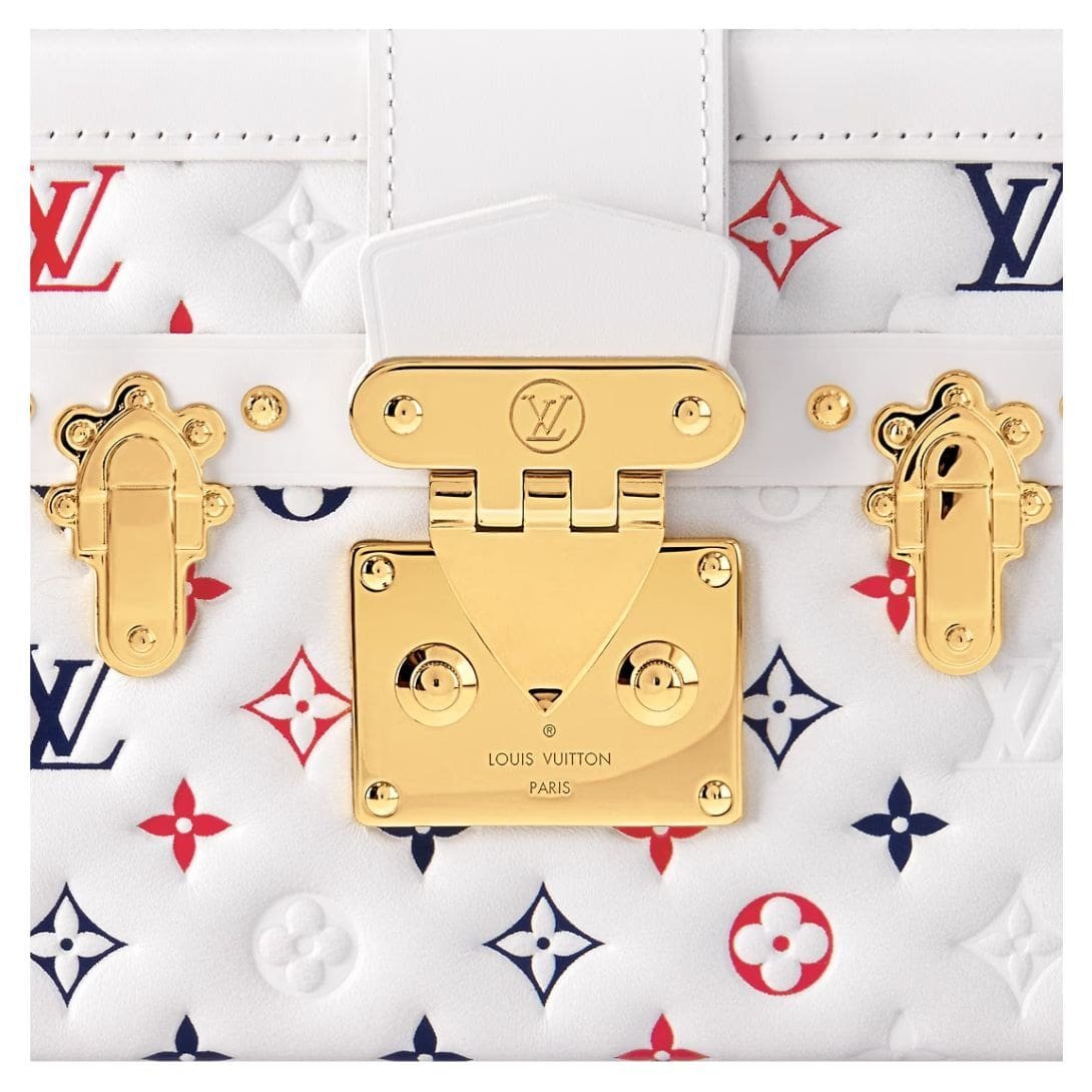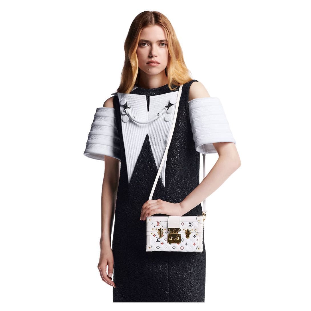 Measuring 7.9 x 4.9 x 2.4 inches, the LOUIS VUITTON PETITE MALLE Tricolore exudes understated elegance and timeless charm, boasting a sleek silhouette and exquisite craftsmanship that sets it apart as a true statement piece. The gold-color S-lock and clasps, along with the white cowhide-leather trim, add a touch of opulence and refinement to the design, showcasing Nicolas Ghesquière’s celebration of the House’s French heritage.